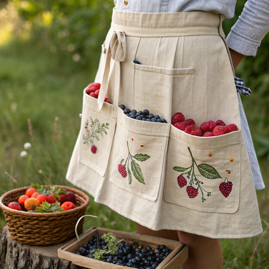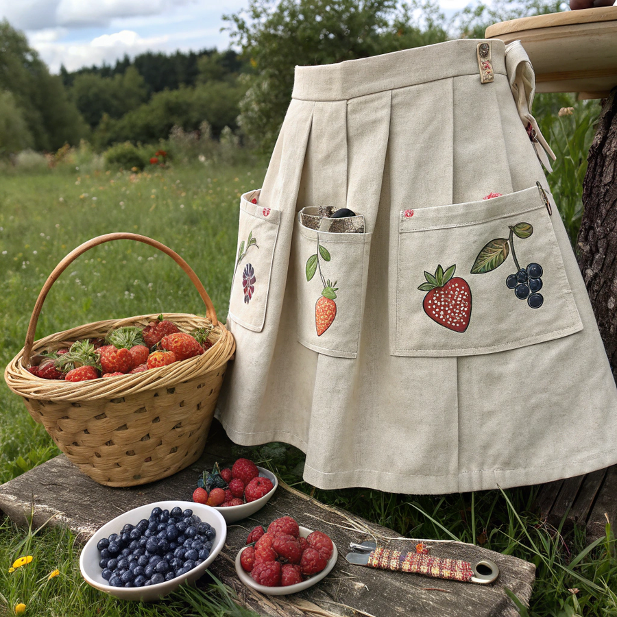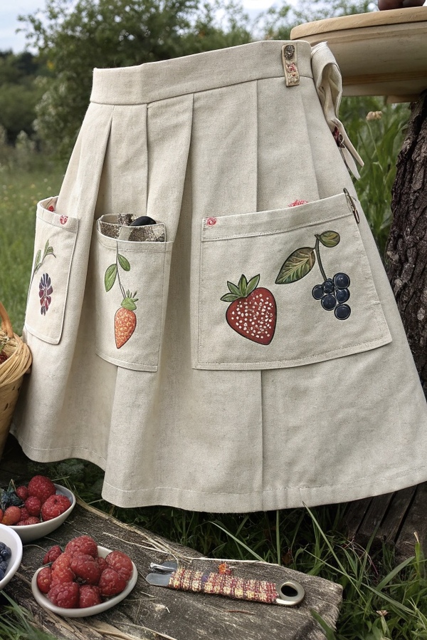 «A handcrafted work apron-skirt designed for berry picking, made of natural linen or cotton fabric. The skirt has many large and deep pockets for collecting berries, arranged around the waist and front. Some pockets are filled with colorful berries — strawberries, raspberries, blueberries. The fabric may feature a subtle berry-themed print or embroidery. The design is practical yet charming, inspired by rustic countryside clothing. Natural daylight, soft focus, realistic textures of fabric and berries, cozy and earthy atmosphere, artisanal handmade style.» Generated in Recraft