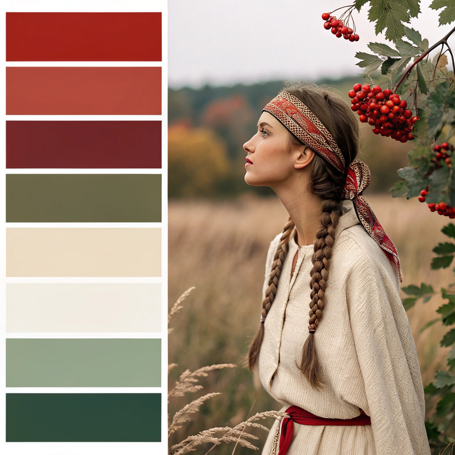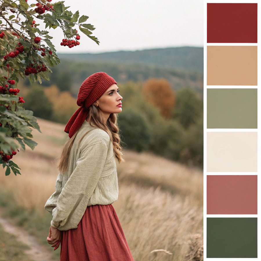 Promt: Create a color palette for the handmade clothing brand «Калина». The brand identity reflects natural simplicity, warmth, and Slavic folk aesthetics. The palette should feel organic, cozy, and inspired by countryside nature — the textures of linen fabrics, the deep red of ripe viburnum berries, the tones of wood, and the glow of soft sunlight. It should include around five to six colors that harmonize naturally: a rich red inspired by viburnum berries as the main accent, a warm beige or cream tone reminiscent of natural fabrics, a soft brown or terracotta shade bringing earthy warmth, a muted green for balance and connection to nature, and a neutral light tone for background and clarity. The overall feeling of the palette should be handmade, calm, and authentic — suitable for minimalist posters, textile tags, and artisanal brand materials. Generated in Recraft