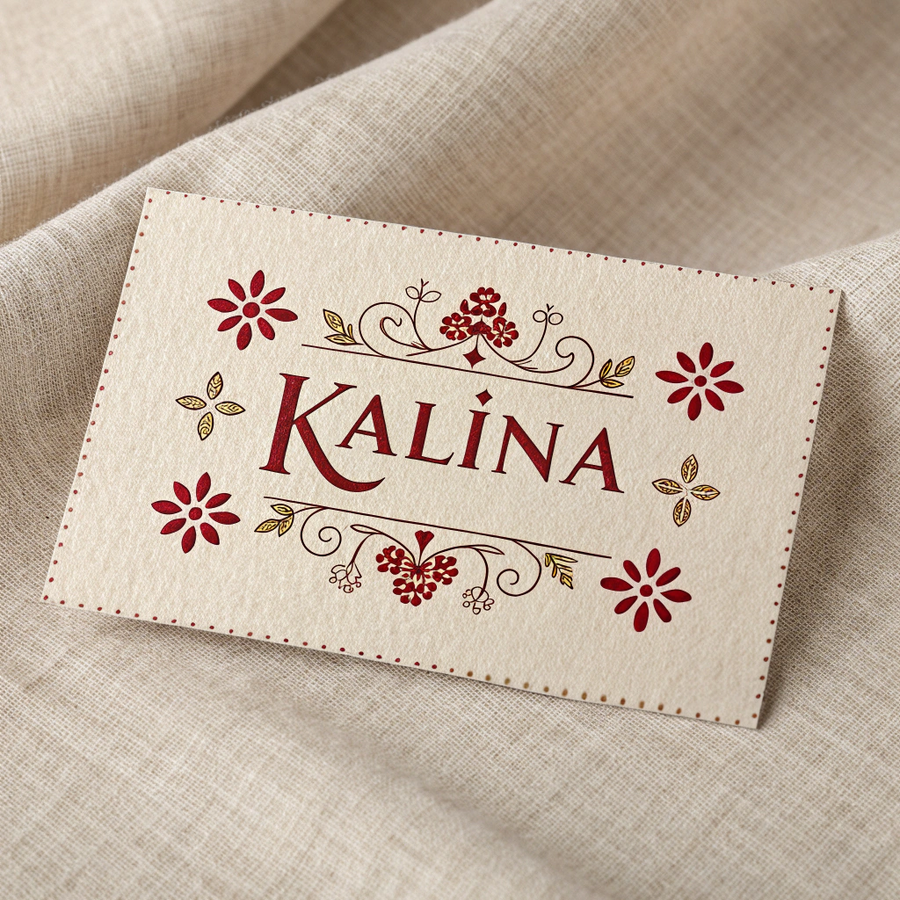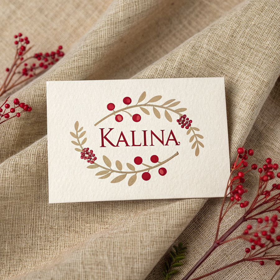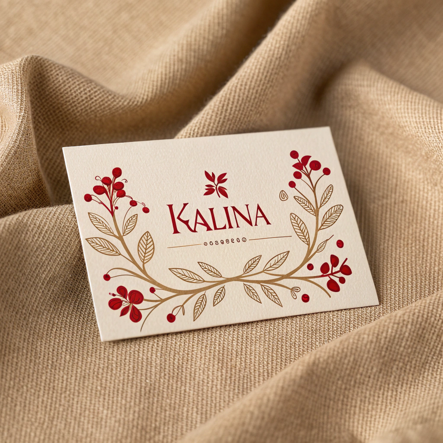 Promt: A minimalist business card design for the handmade clothing brand «Калина». The card features the brand name «Калина» in elegant decorative Cyrillic lettering inspired by Slavic folk aesthetics. The color palette reflects the brand identity — deep viburnum red as the accent, warm beige and linen cream as the background tones, and soft brown for typography or details. The design feels handmade yet modern, with natural texture reminiscent of fabric or craft paper. Clean composition, balanced white space, calm and organic mood, artisanal brand identity. Generated in Recraft