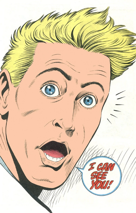 Вот смотришь героя в костюме, и он смотрит на тебя. Он может в разгар драки вдруг подмигнуть тебе и бросить реплику вроде «Нормальный такой злодей, да?» или сказать о том что нужно перевернуть страницу комикса. В этот момент возникает ощущение, что вы с ним заодно, что вы делите какую-то внутреннюю шутку. Это создает невероятное чувство близости — будто ты не просто читатель, а его личный друг и соучастник происходящего.