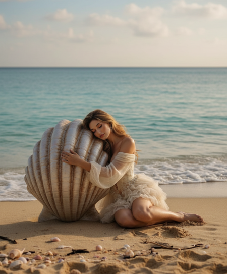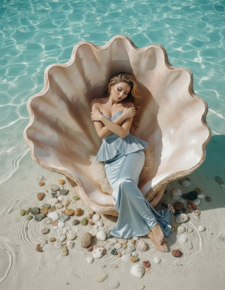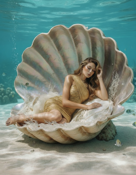 Идея представляет собой сюрреалистический диалог между скульптурными формами бренда и органической архитектурой морской раковины, создавая атмосферу застывшего момента между сном и явью.