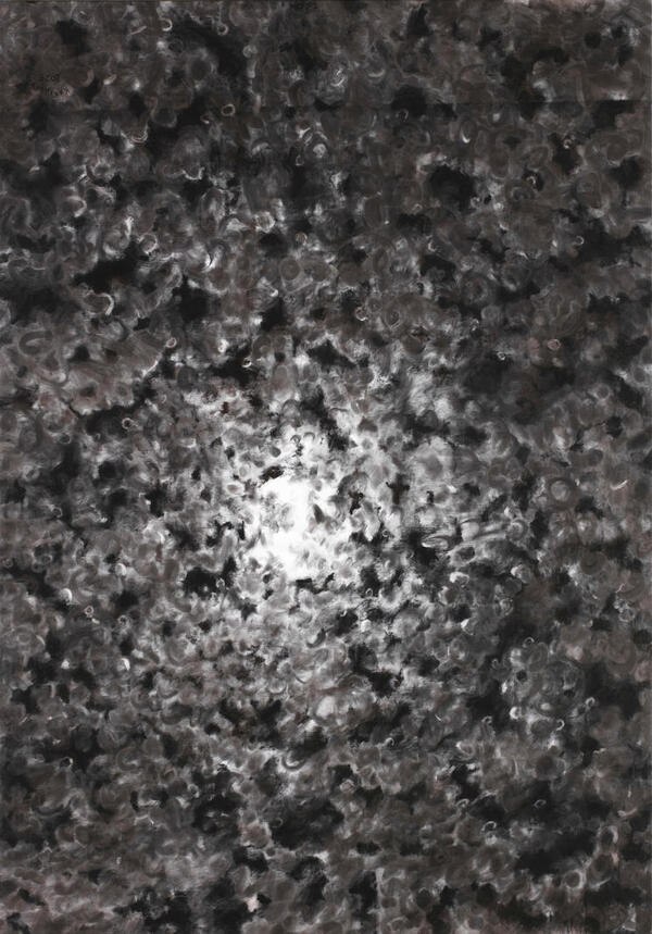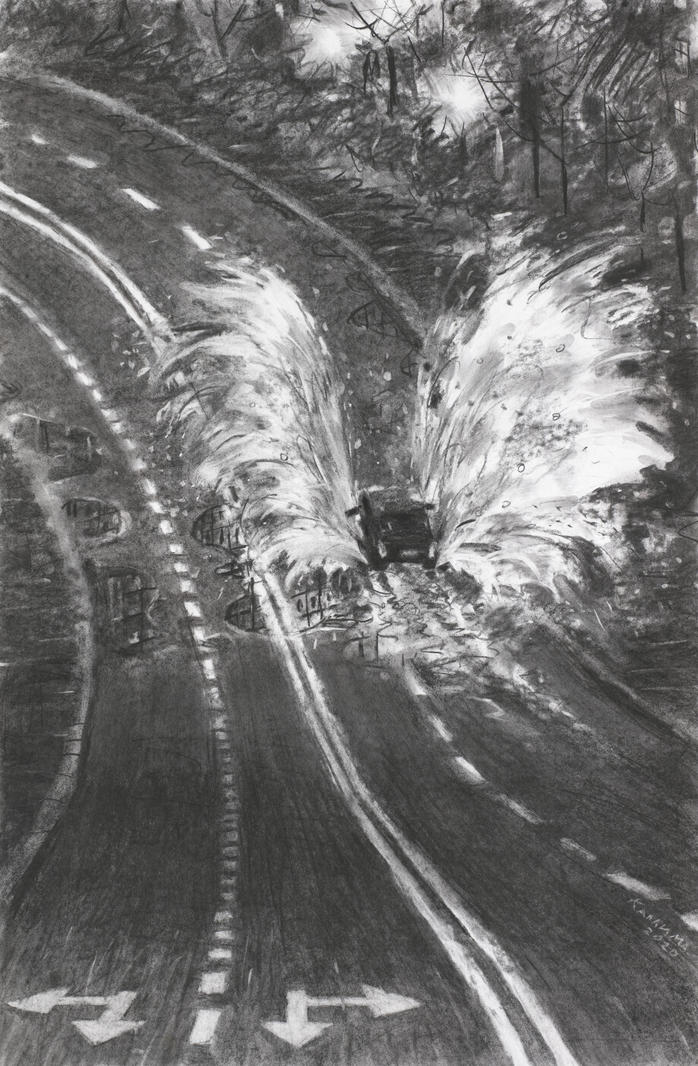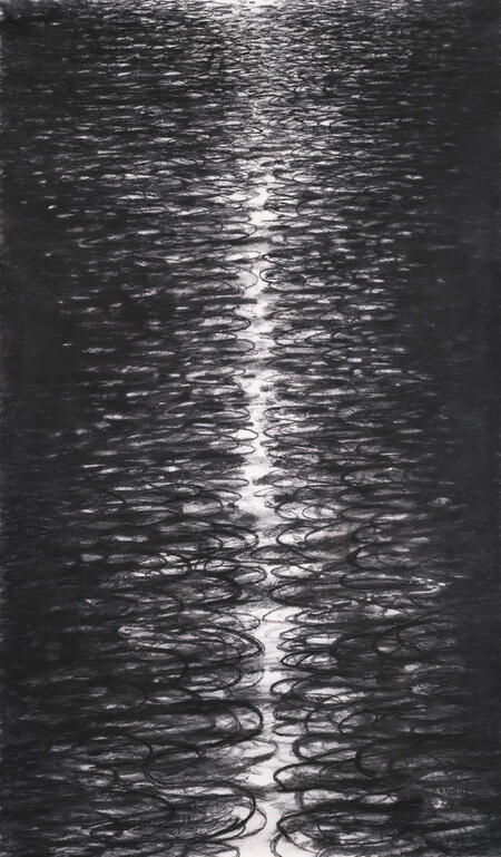 Обе работы ниже, написанные углем по траектории завихрений, содержат образ лунного света. Эффект рассеивания света создается за счет темноты вокруг: «Художник признается, что ему было важно нарисовать светящийся столб, сдавленный по бокам мраком и чернотой. Он светится за счёт того, что вокруг мрак», — пишет VLADEY о работе «Лунная дорожка» [7].