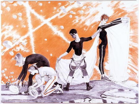 Сангина выделяет характерные черты парашютисток или же придает утопичности воздушной стихии неба, создавая ощущение свободы, при этом часто используются сложные ракурсы и выделяется пластика героинь. Оранжевый цвет выделяет ключевые элементы и направляет взгляд зрителя, что ближе к традициям советского плаката, где цвет часто выполнял функцию сигнала и смыслового выделения [9].