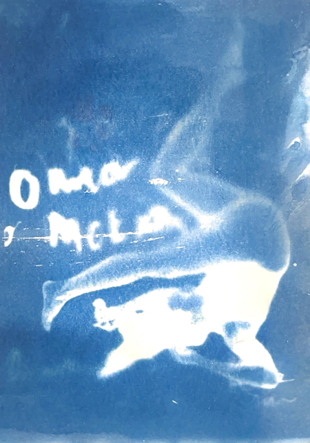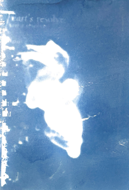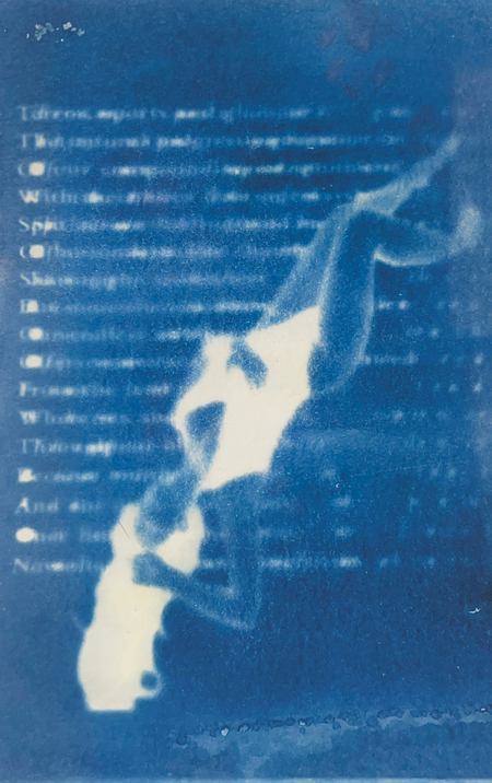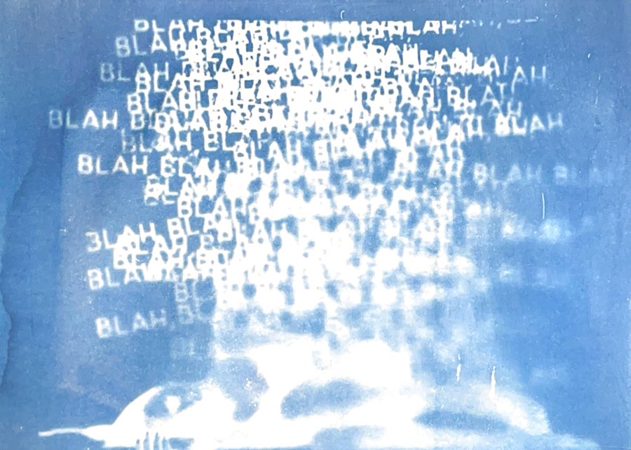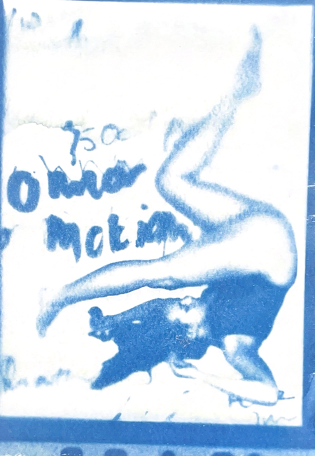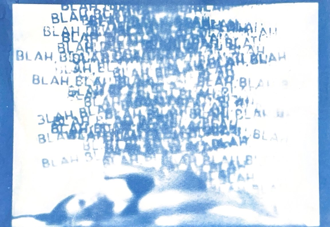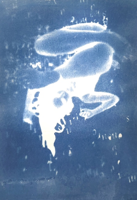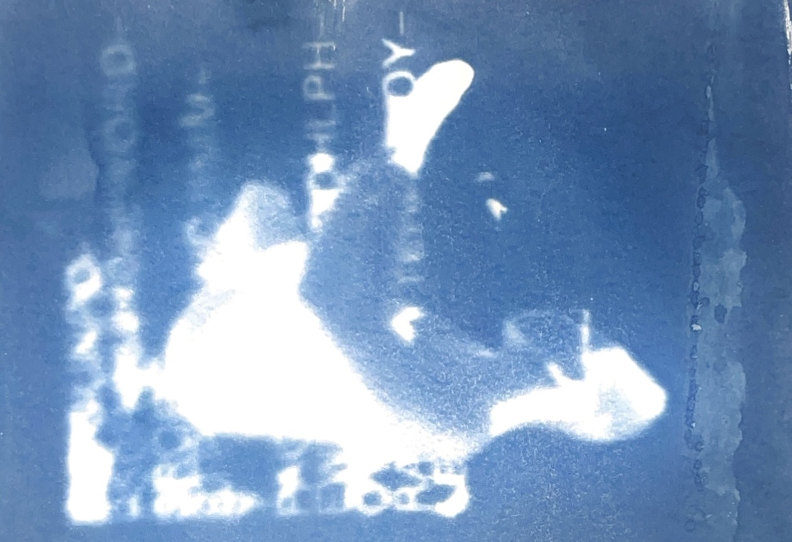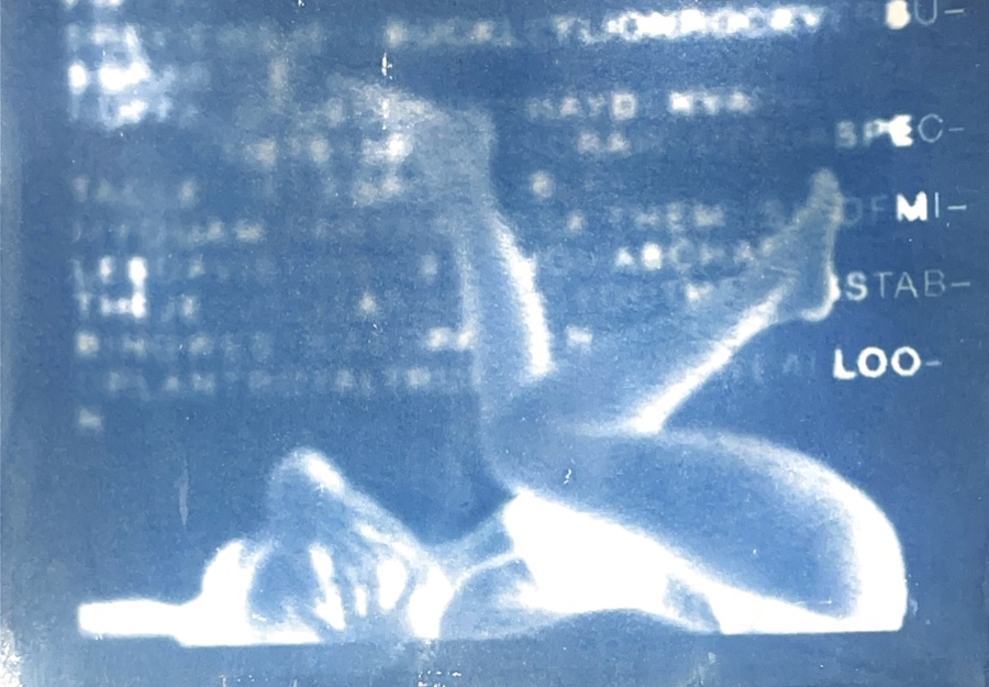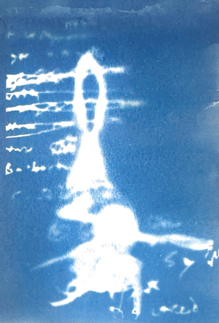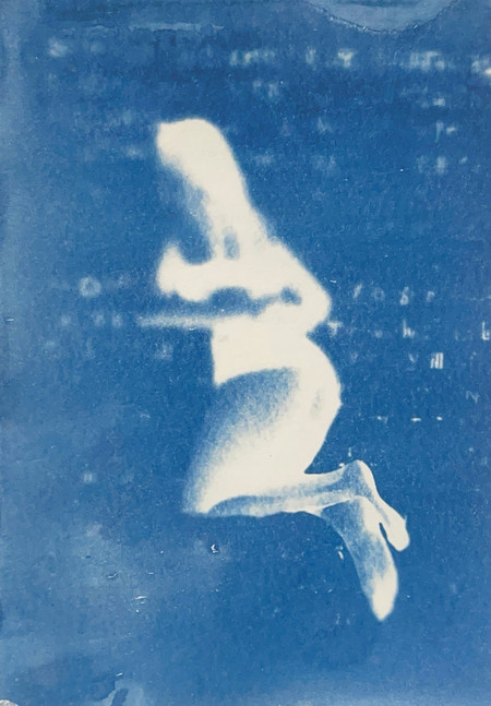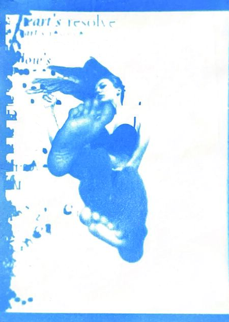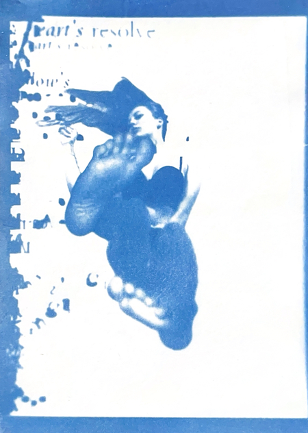 Я исследую хрупкость тела и смысла через цианотипию. Женская фигура, вырезанная из привычного контекста, погружается в абстрактное пространство с размытым текстом. Контуры тела становятся символом утраченной идентичности, а текст — метафорой недосказанности. Синие оттенки и несовершенства техники подчеркивают хрупкость памяти и восприятия, создавая пространство для размышлений о границах формы и смысла.