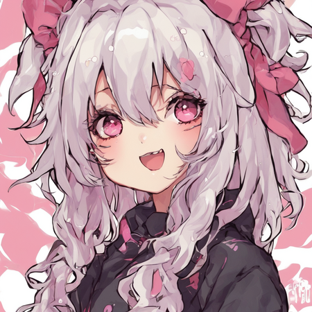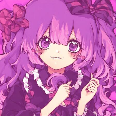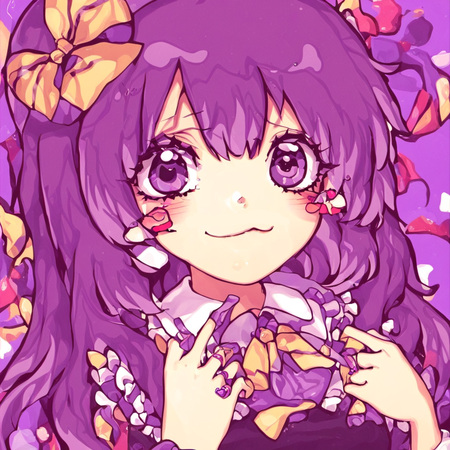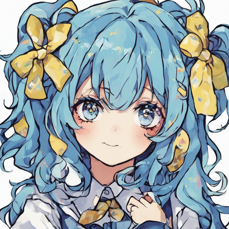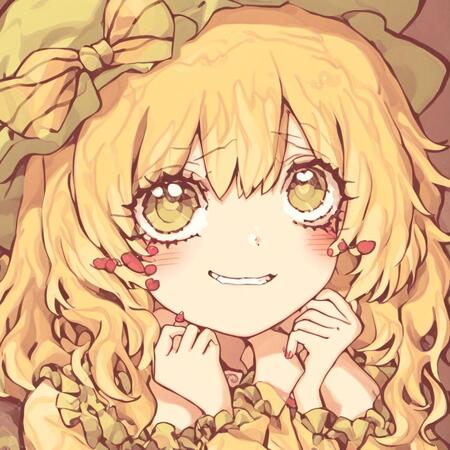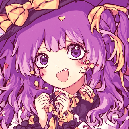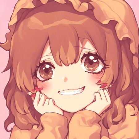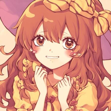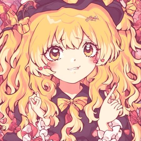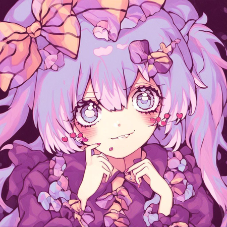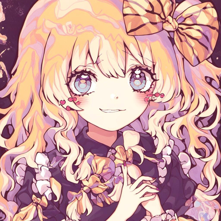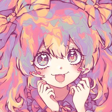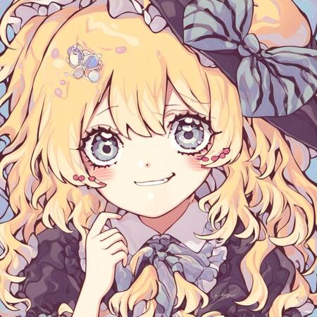 Видно, что генеративная модель смогла уловить стиль художницы — большие сверкающие глаза, плавные линии, динамичная обводка, нежные цвета, миловидность, румяна с сердечками, а также способ накладывания света и теней. Более того, на сгенерированных иллюстрациях часто заметна шляпа с бантом — в датасете было много картинок с таким элементом одежды, поэтому и модель стала часто их добавлять.