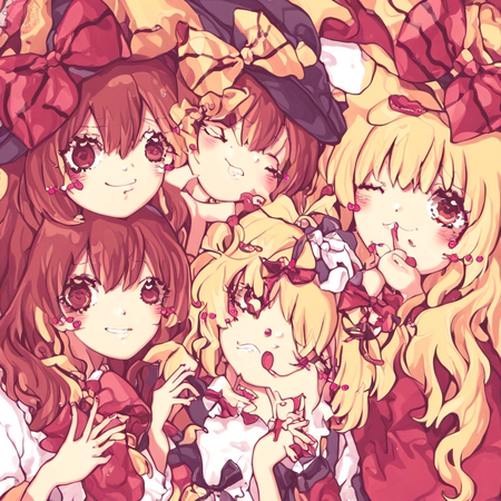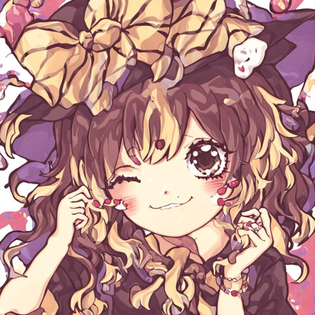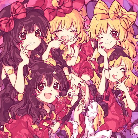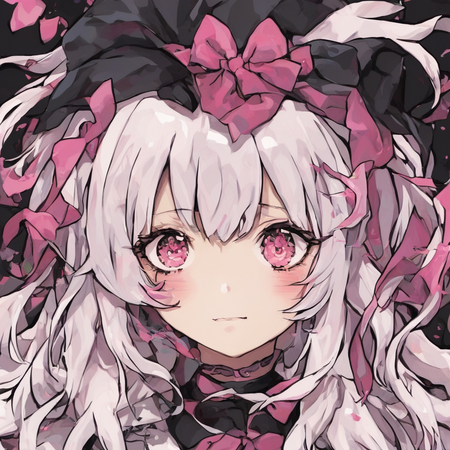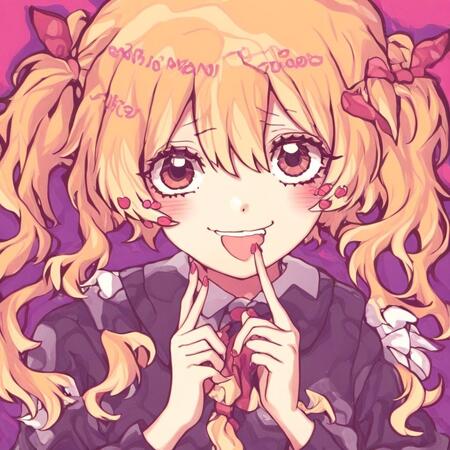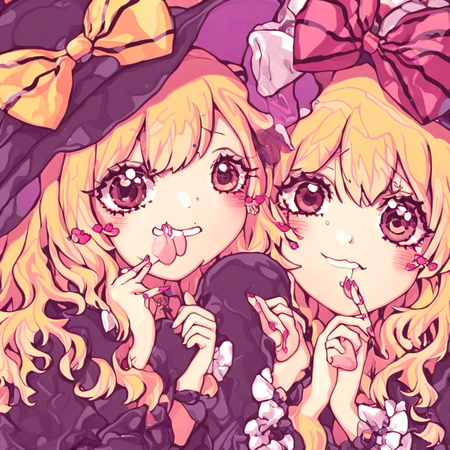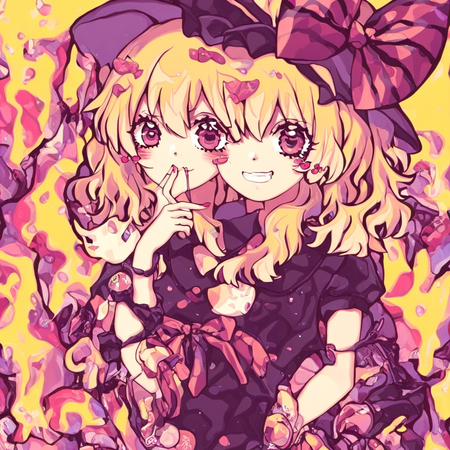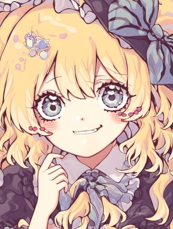 Результат мне понравился, получилось меньше артефактов. Элементы стиля Suzukannn, а именно большие искрящиеся глаза, румяна, лайн, банты, локоны — сохранились. Однако стиль покраса теперь напоминает акварельный, сердечки на щеках отсутствуют, да и лицо персонажей теперь выглядит менее детским.