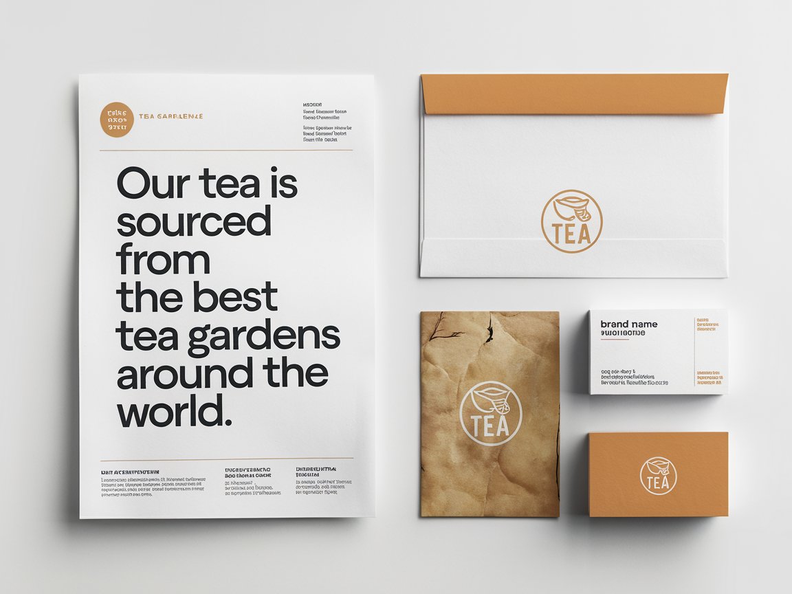 Документация сгенерирована ideogram.ia (промт: «generate a mockup of printed materials (paper, envelope, business cards) on a white background for the tea brand»)