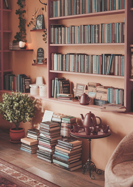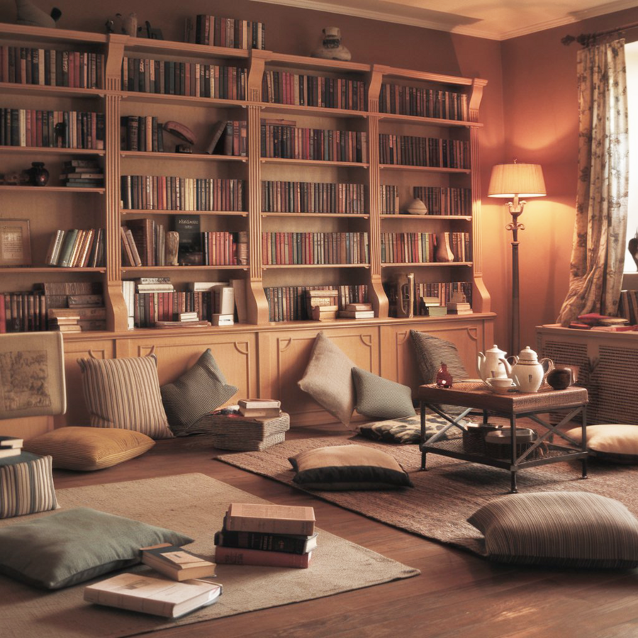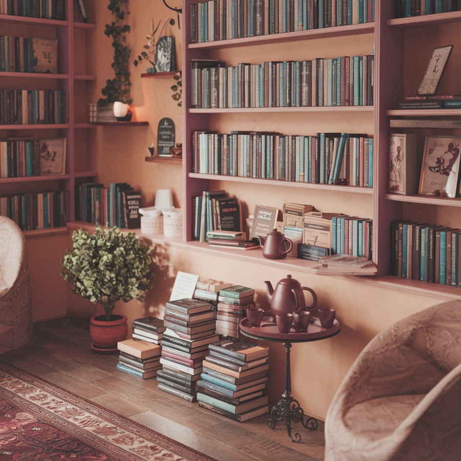Второй вариант от ideogram.ai (промт: «Generate a cozy, warm, soft interior for a literary tea room. Add some books, cups and teapots to it»)