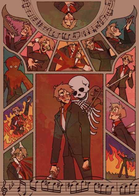 Мой итоговый проект представляет собой серию постер-комиксов. Сюжет повествует о преимуществах и издержках дара бессмертия, действующие лица — мои оригинальные персонажи. Работа является вольной интерпретацией сонаты «Дьявольские трели» Джузеппе Тартини, ноты из произведения включены в постеры в качестве декора. Композиционно комиксы отсылают к православным иконам, изображающим житийный цикл святых. Также постеры вдохновлены иллюстрациями к «Тристану и Изольде» Франца Штассена.