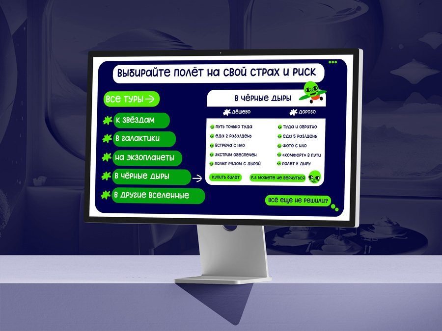 Добро пожаловать в космическое турагентство «Spacegine» — ваше окно в безграничную вселенную! Присоединяйтесь к нам, чтобы испытать экстремальные моменты невесомости и увидеть самые заброшенные уголки космоса.