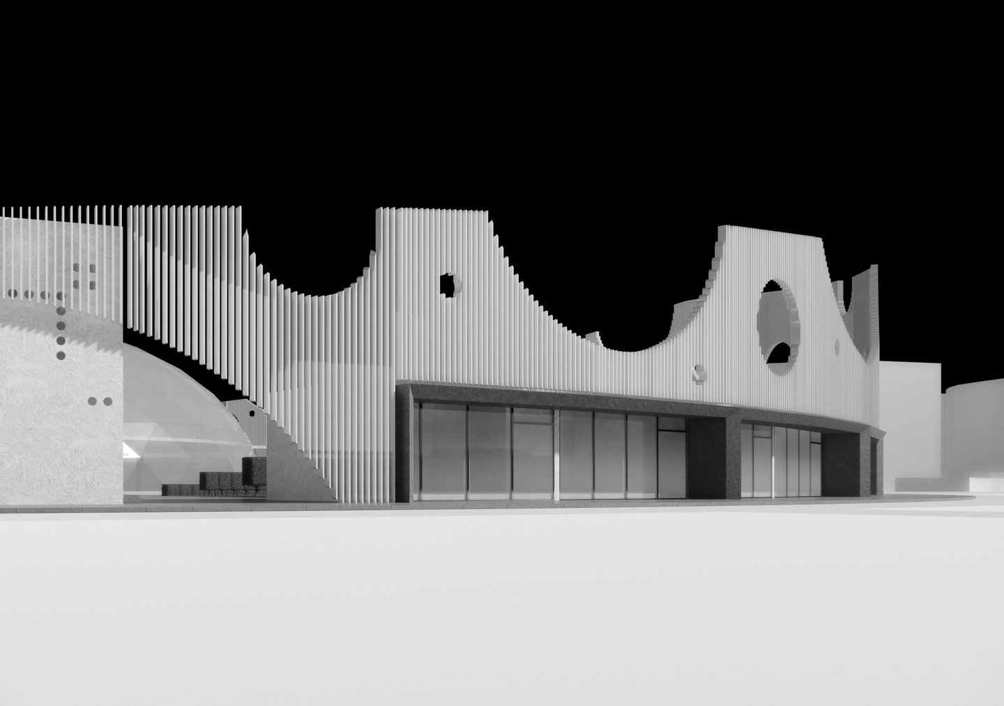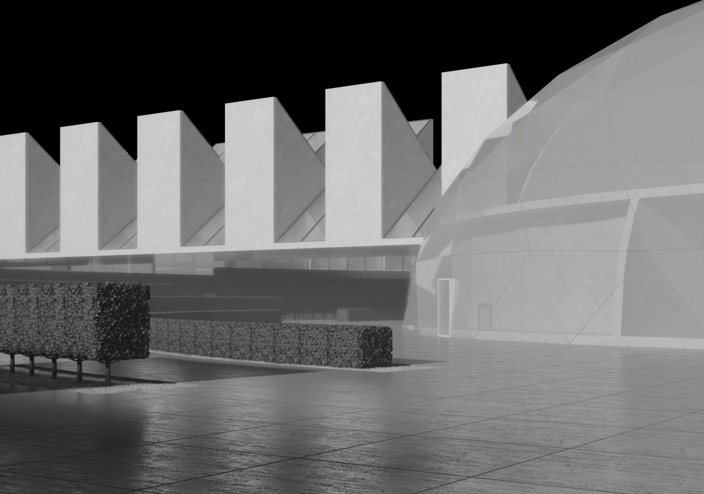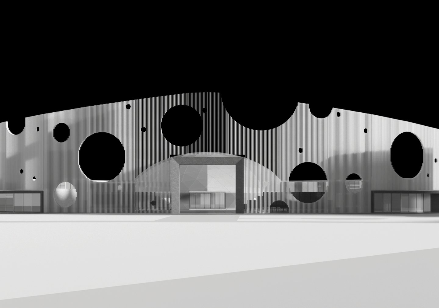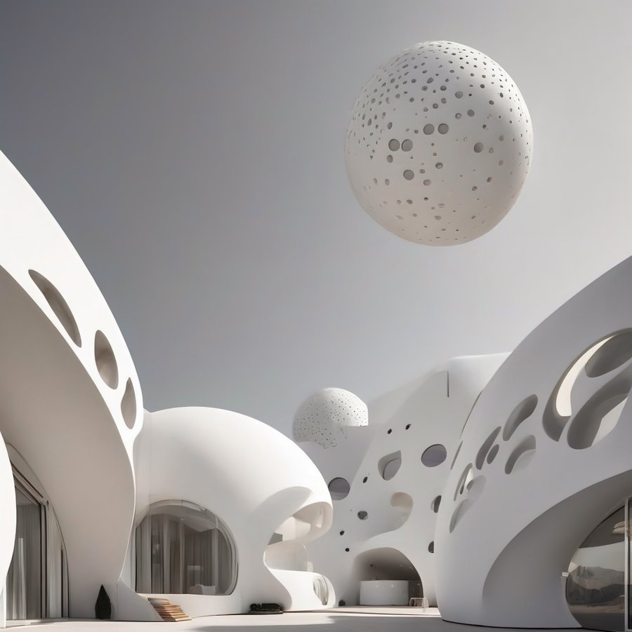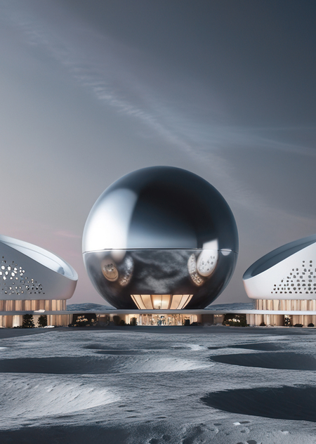 Leonardo Ai / prompt / The hotel is in the aesthetics of the moon, with white facades with perforations of different sizes. Three semicircular buildings and a geosphere.