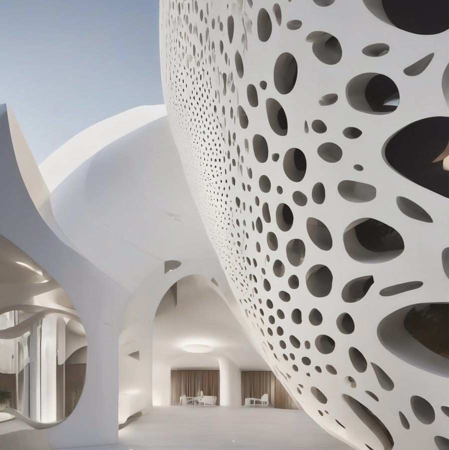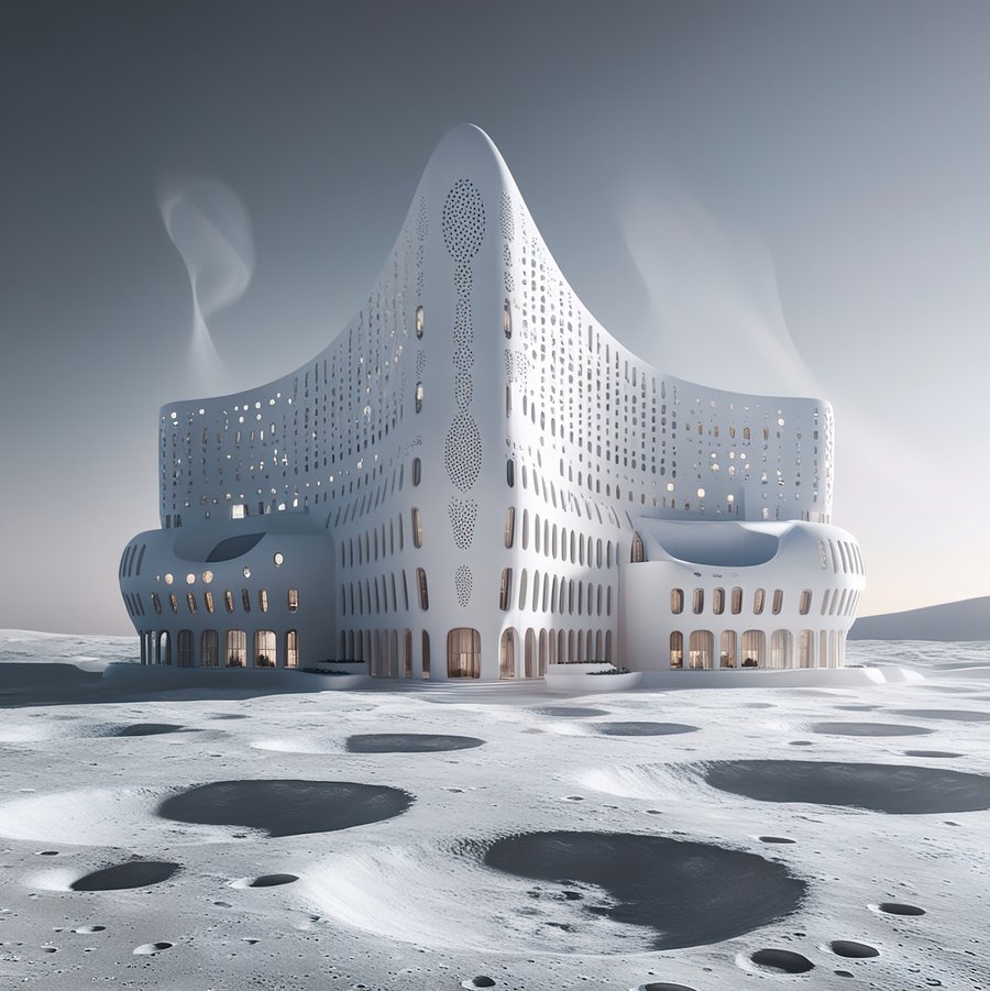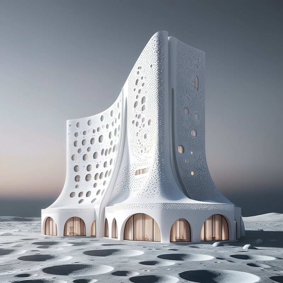 Leonardo Ai / prompt / A hotel in the aesthetics of the moon, with white facades with perforations of different sizes.