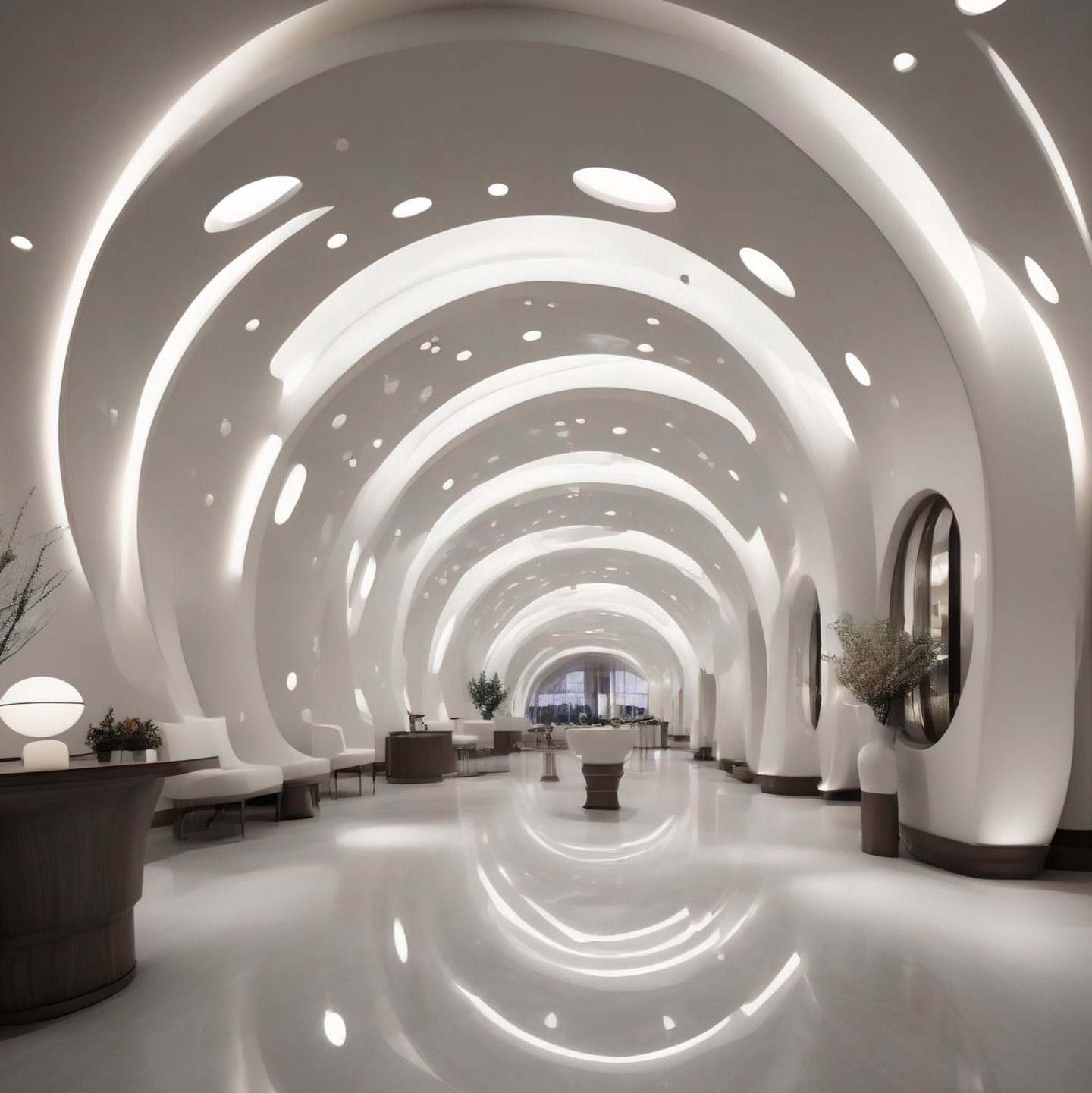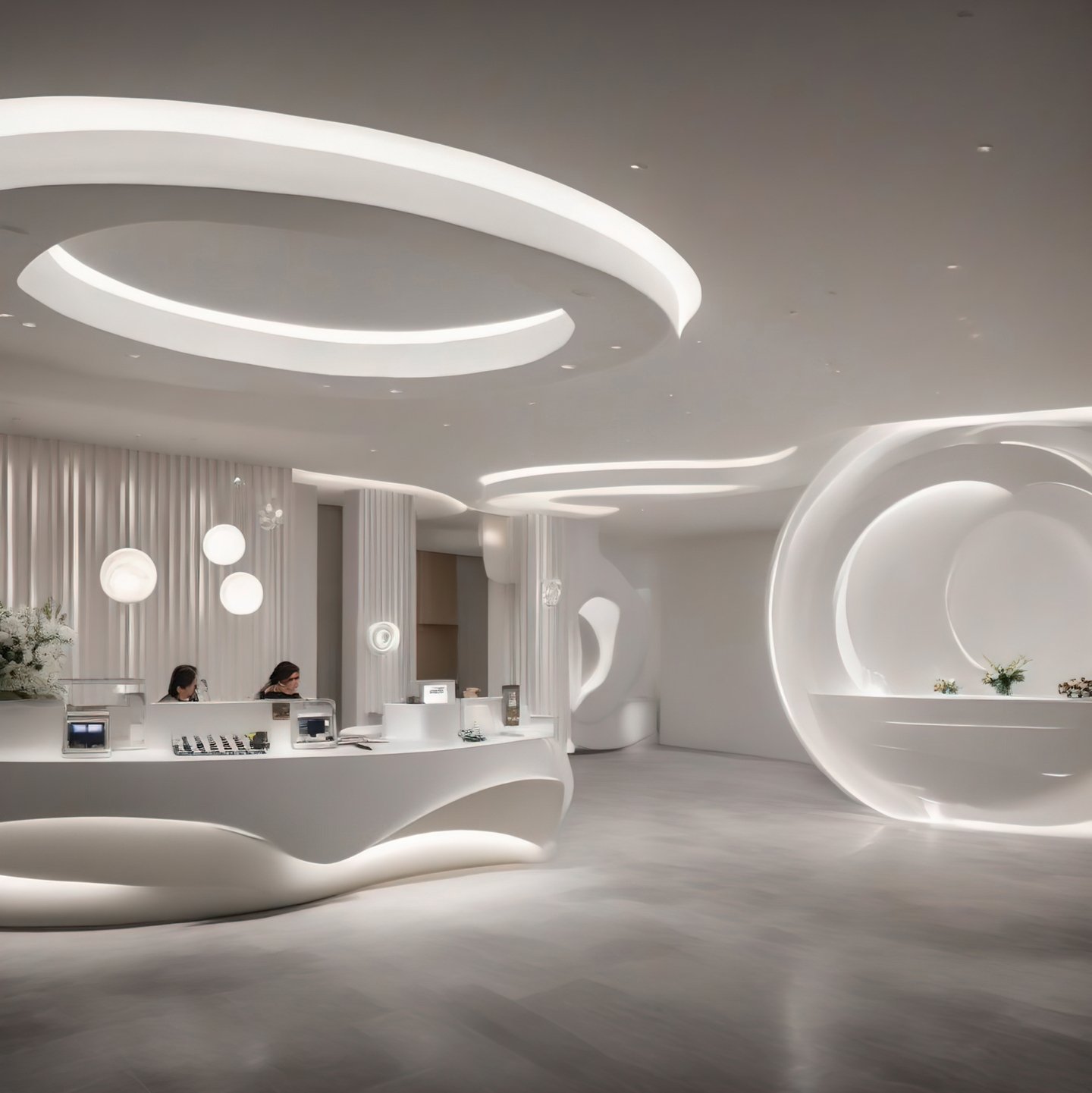Stable Diffusion / prompt / Reception in the hotel with a lunar aesthetic, with white facades, round windows of different sizes, cool lighting.