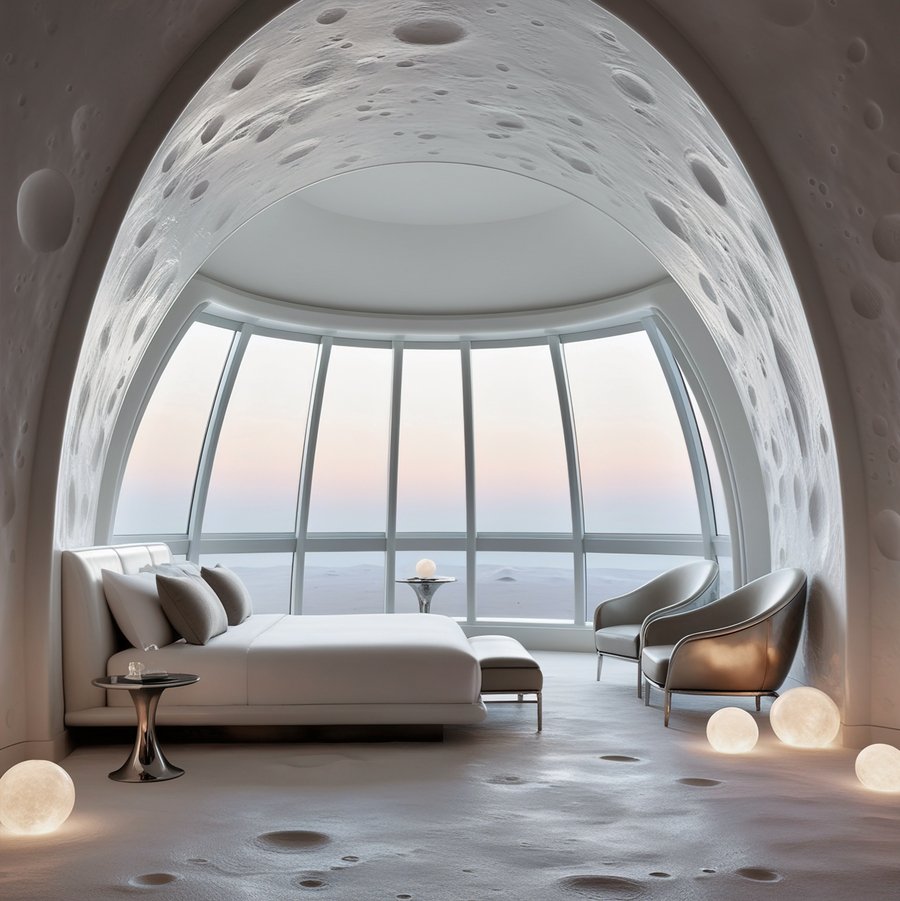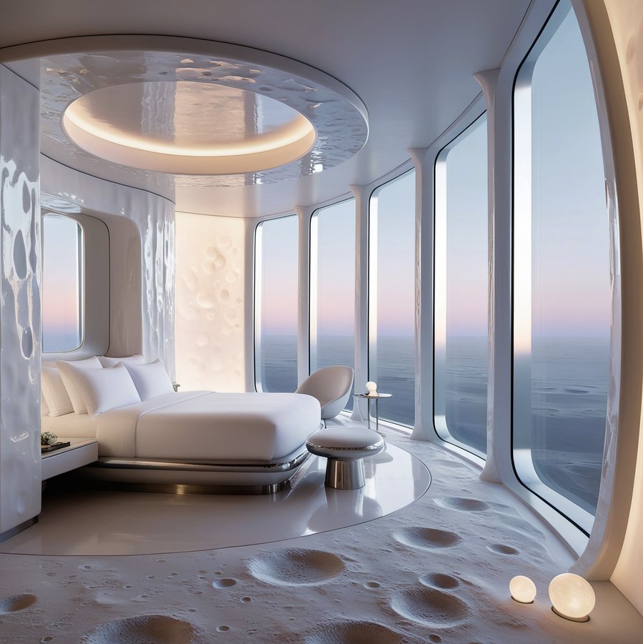 Leonardo Ai / prompt / A hotel room in a lunar aesthetic, with white facades, large panoramic windows, and cool lighting. Streamlined shapes, lunar decor.