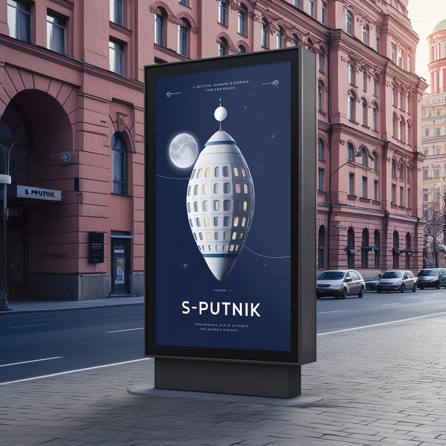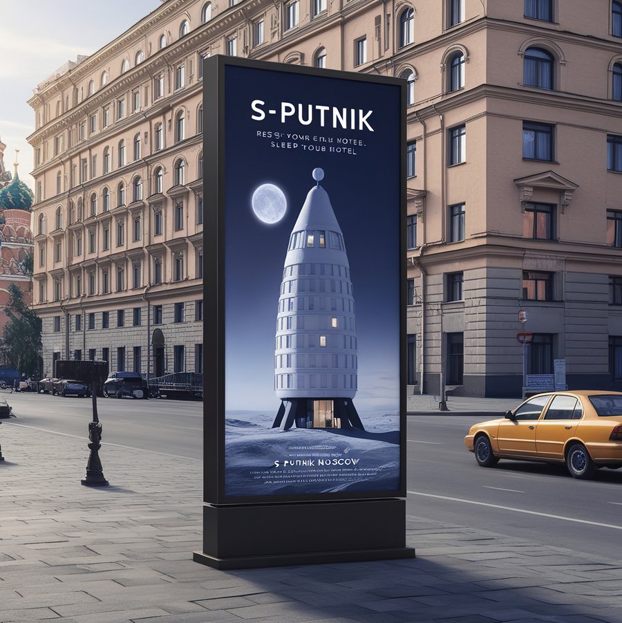 Leonardo Ai / prompt / Generate a mockup of vertical advertising poster for a hotel with a lunar and travel aesthetic called «S-PUTNIK» in the urban Moscow environment on billboards. Minimalistic and futuristic poster about rest, sleep, comfort.