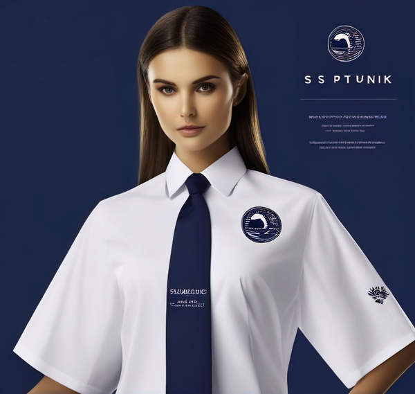 Leonardo Ai / prompt / Create a mockup of branded staff uniforms with print for a hotel with a lunar and tourist aesthetic called «S-PUTNIK». The uniform features a vector logo with an image of the moon and a rocket. Minimalistic white linear logo on dark blue background, no shadows or gradients.