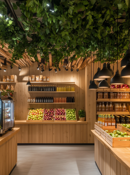 [2] MJ The interior design of the grocery store features wood elements on the ceiling and walls. The display counter showcases bottles with apple juice, and behind it are wooden boxes for fruits. Modern lighting fixtures hang from the ceiling, and greenery overhead creates an atmosphere reminiscent of a farm shop