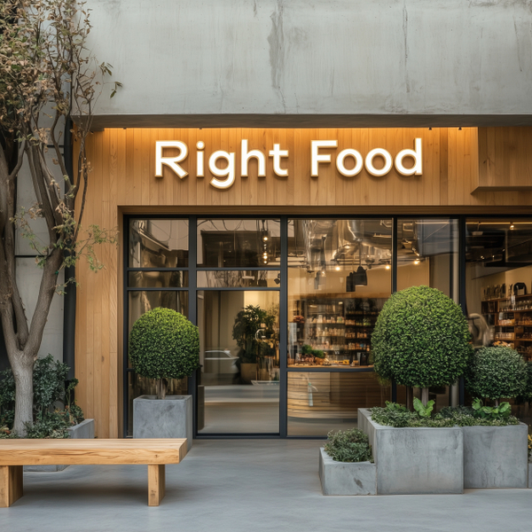 [1] MJ A photo of the facade sign «Right Food» on an elegant store, with a minimalist design featuring large letters, plants in pots, and topiaries. A bench for waiting is placed near it. In front, there’s a glass door that leads inside. The architectural style is minimalistic, with concrete walls and a light grey color palette