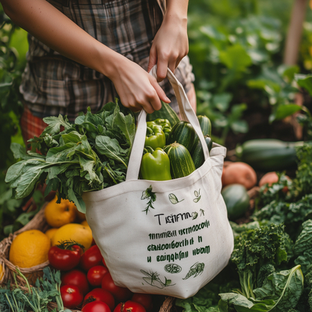 [1] MJ Fashionable female hands in her beautiful home garden holding an organic cotton tote bag, filled to the brim with anthropomorphic vegetables and fruits from their personal farm, in the style of Unsplash photography, natural light