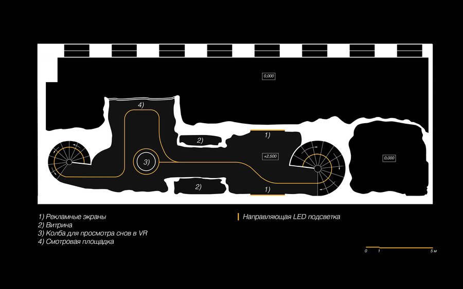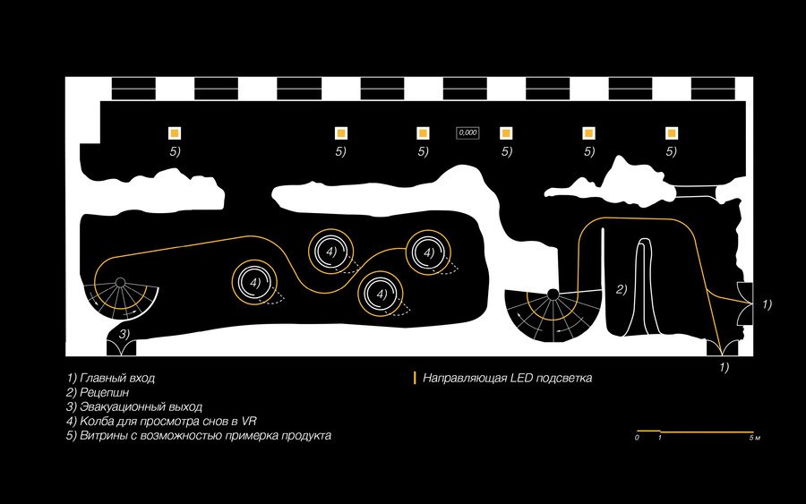 Основной продукт бренда — кольцо, записывающие сны. Оно способно совместить два полярных состояний человека — сон и бодрствование. Именно поэтому пространство шоурума разделено на две контрастные зоны