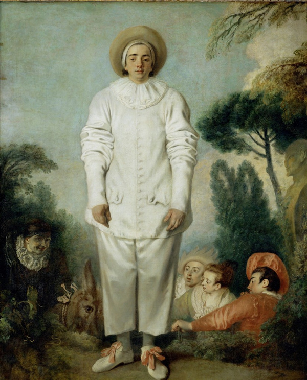 Первый герой из легендарной комедии Дель Арте, которого мы рассмотрим, будет Пьеро. На картине «Жиль» кисти Ватто изображен актер в костюме Пьеро. Он стоит на переднем плане, будто на сцене театра. Его эмоции выразительны. Далее на втором плане, словно за сценой находятся другие актеры, они увлечены беседой, все их эмоции выразительны и отчетливо считываются. Словно они носят маски и все игры на сцене. Стоит сказать, что пейзаж также ненатурален, выдуман, нереален и подчиняется рамкам театральности. Это придает ему характер декорации.