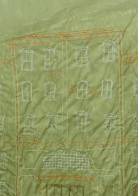 Здания создают организованную среду для жизни и деятельности человека. Но мне нравится думать, что они нечто большее. Как неустанные наблюдатели, они стоят, вбирая в себя день за днем историю. Они помнят все и впечатывают в себя нестираемым пятном судьбы людей. Но приходит время, и дома окутывают зеленой тканью. Они стареют в одиночестве, мутным зеленым пятном, медленно рушась изнутри. История превращается в серо-бурый порошок, который уже ничего не сможет запомнить. А я смогу. Своей работой я хочу передать силу хрупкого здания, просачивающегося сквозь зеленую ткань. Здания которое никто не восстановил, но образ которого вырвался из своего предсмертного кокона.