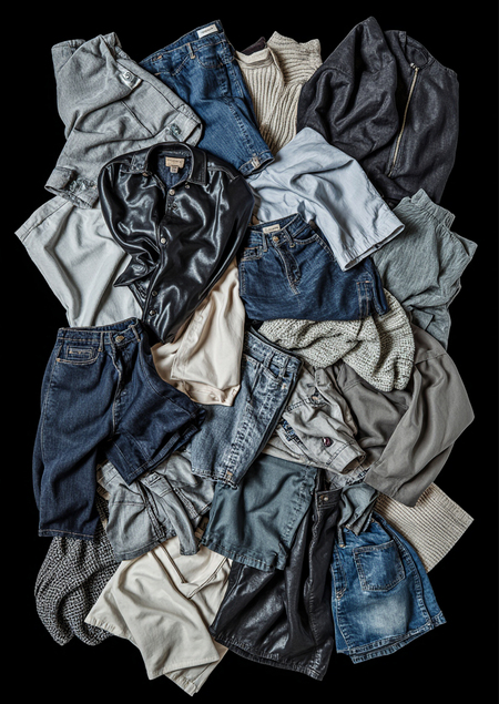 Для создания обложки проекта я использовала нейросеть Krea. promt: Generate a pattern realistic image with a lot of different stylish clothes on black background that overlap each other
