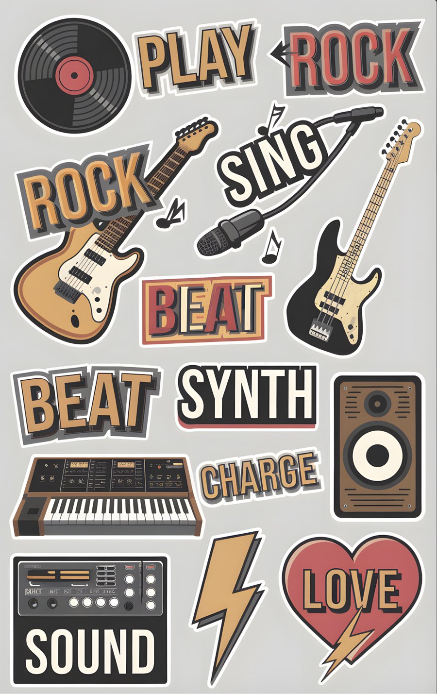 В качестве дополнительных носителей я решила сделать стикеры с помощью Ideogram Image promt: make 10 stickers on one canvas for the REGIST recording studio. Use large font and retro style. The stickers should convey a metaphor of music and energy