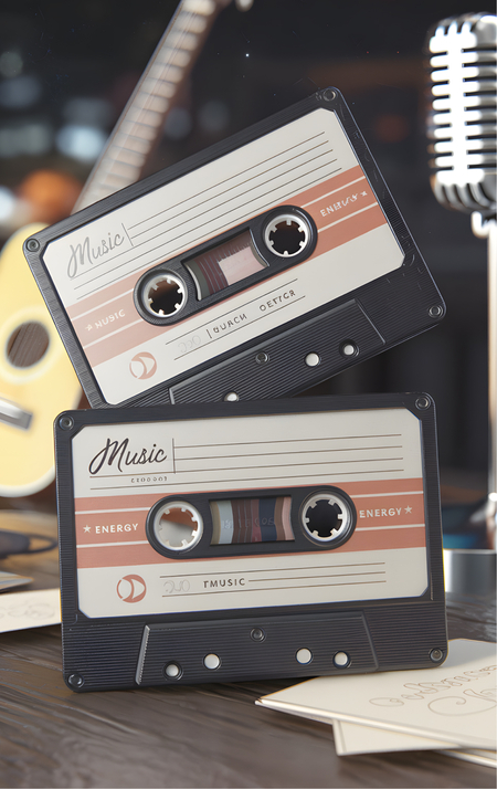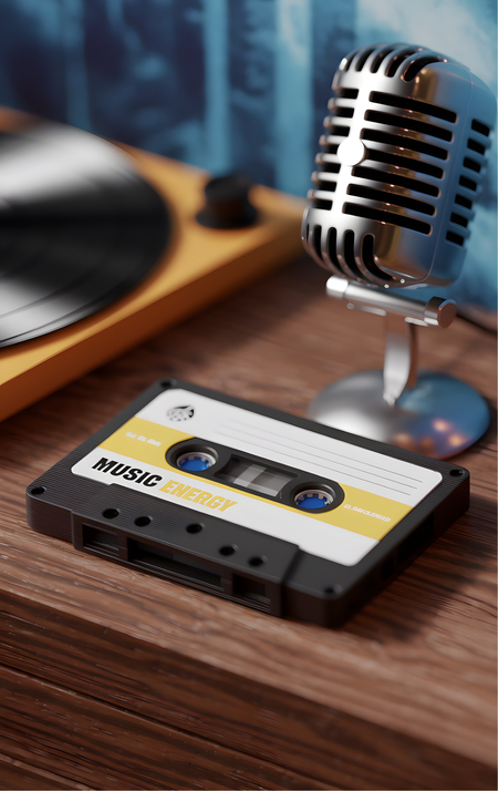 image promt: make 3D renders of two retro style music cassettes. The design is minimal. They should convey a metaphor of music and energy