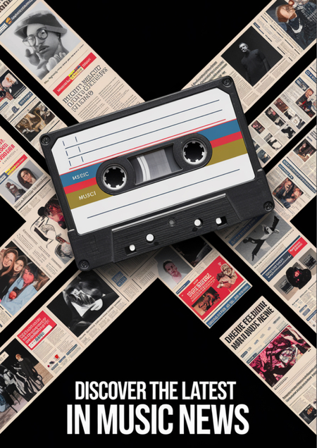 2. Promt image: An interesting advertising poster that advertises the REGIST recording studio. There should be a cassette tape in the foreground and folded news papers in the background Для постера, сделанные