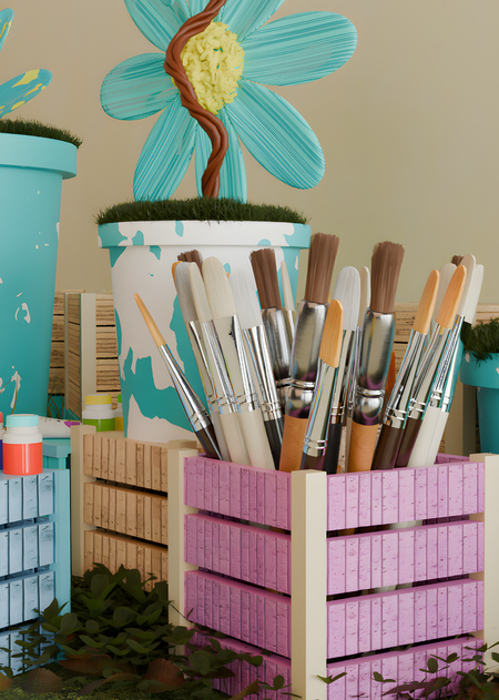Передвижник — это сеть магазинов для художников с большим ассортиментом и яркими интерьерными акцентами внутри магазинов. Данная витрина — сезонная, она представляет собой творческий палисадник, оформленный художником. В нем можно найти различные художественные материалы, продающиеся в передвижнике.