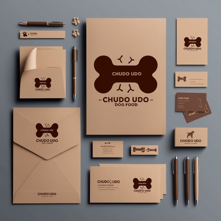 promt: create a complete set of branding materials for the company «chudo udo», specializing in the sale of dog food. Materials should include paper, envelopes, business cards, pens, etc., all with the company logo. The logo shows the shape of a bone and below it says chudo udo Include design elements, bones and lines, place a small dog in the design, the whole design is in shades #F5E3D0, #BF9578, #883F32, #6A4C48