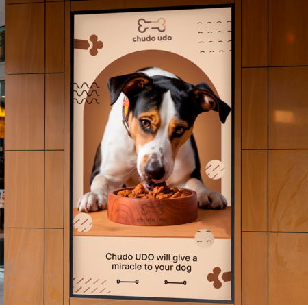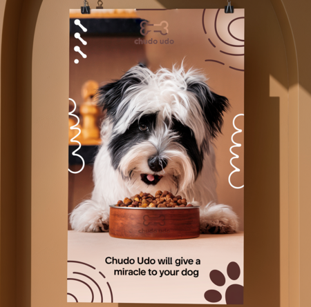 promt: vertical advertising poster for a dog goods store, the poster depicts a dog eating delicious food from a wooden bowl, it says chudo udo will give a miracle to your dog in shades #F5E3D0, #BF9578, #883F32, #6A4C48, graphic elements in the form of lines and bones, high image quality and realism