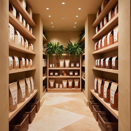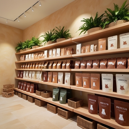 promt: create a modern, stylish space for the sales area of a dog goods store, in light beige tones, there are a few plants in the interior; interior elements reflect the company’s style in shades #F5E3D0, #BF9578, #883F32, #6A4C48, an illuminated logo sign is placed above the payment area for purchases, the logo shows a bone, and underneath it says chudo udo, there are packages of food on the shelves
