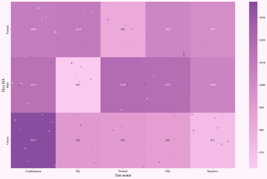 Сначала мне стало интересно, зависит ли тип кожи, для которого создаётся косметика от пола, для которой продукт производится? Я сделала тепловую карту