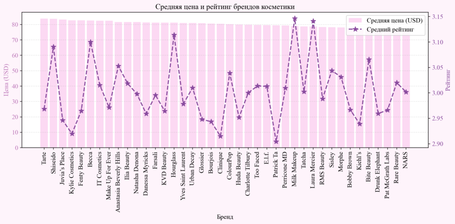 Мы сразу можем увидеть, что самые высокие рейтинги у брендов Milk Makeup и RMS Beauty. При этом средняя цена у них не такая высокая по сравнению с другими брендами. Самые низкие рейтинги у трёх брендов в разной ценовой категории ♡