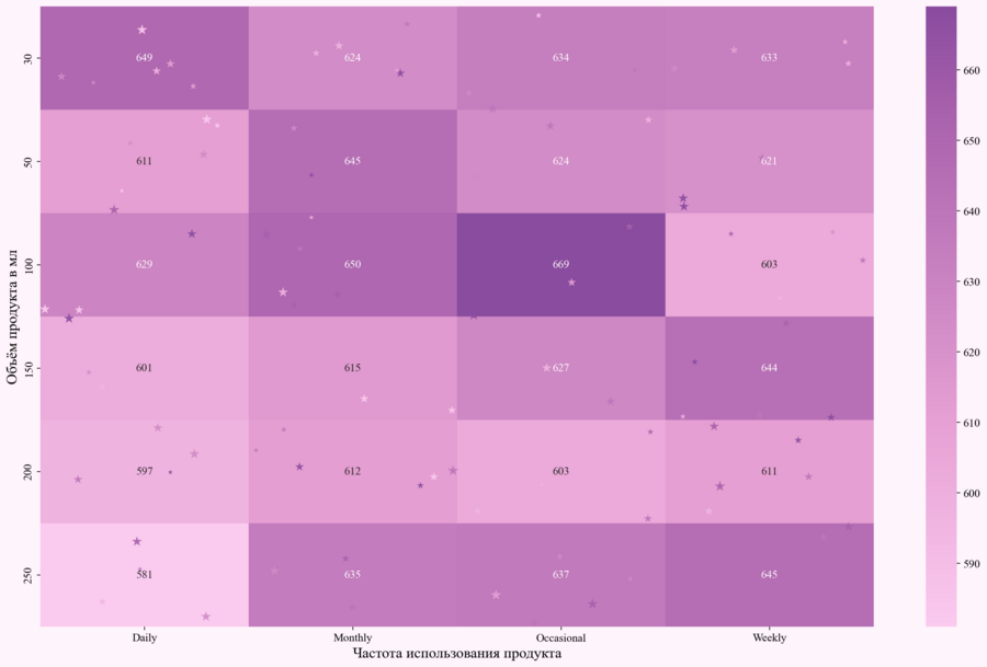 Потом меня озадачил вопрос: влияет ли предполагаемая частота использования средства на его объём? Снова сделала тепловую карту.