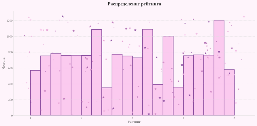 Решила посмотреть, насколько строги опрашиваемые этого датасета и сделала гистограмму частоты рейтинга ♡