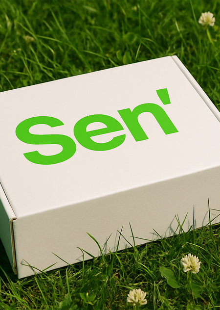 Promt: A realistic 4:3 photograph of a white cardboard box lying on lush green grass with small clover flowers visible around it. The box has the modern, graphic logo «Sen’» printed on it in a neon green color (similar to the signature color of Golden Apple beauty store). The logo is in a bold, clean grotesque font. The setting feels fresh, natural, and minimalistic — a calm spring or summer vibe with soft lighting and shallow depth of field. --v 6 --ar 4:3 --style photographic --q 2 (Midjourney)