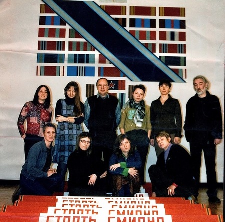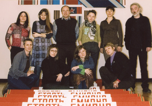 Сотрудники отдела новейших течений Новой Третьяковки на фоне инсталляций художника Бориса Орлова, 2006 год