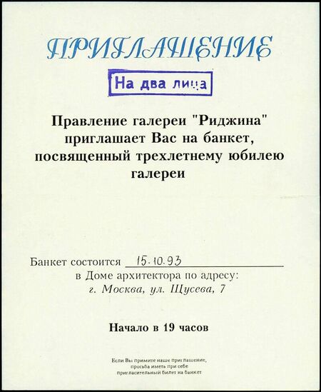 Приглашение на банкет, посвящённый трёхлетнему юбилею галереи «Риджина», 1993 год.