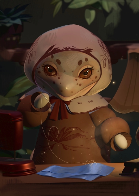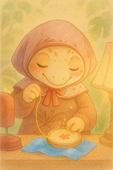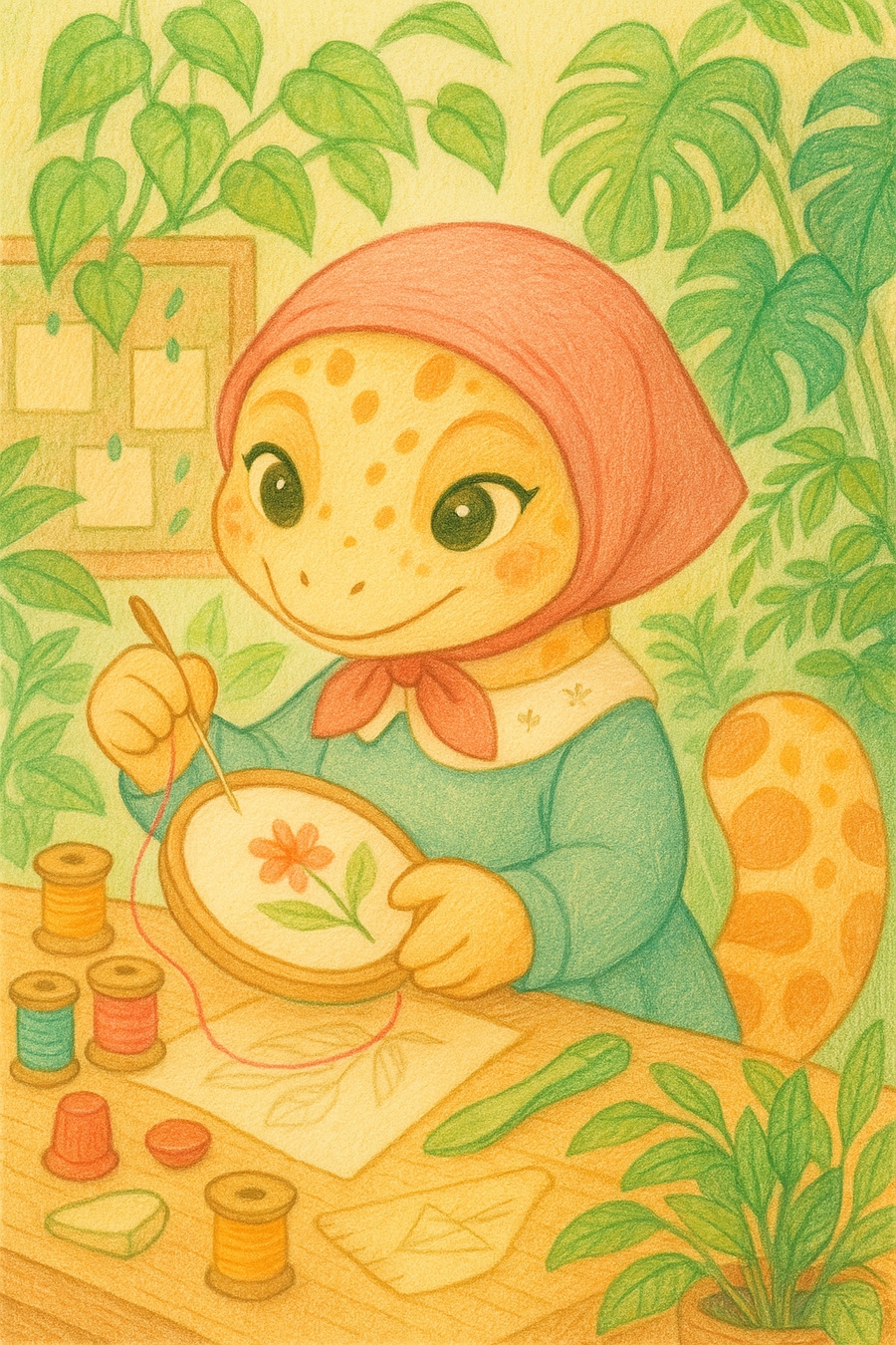 Chat GPT: A cozy, cinematic key art for a student portfolio page: anthropomorphic leopard gecko (Eublepharis macularius) seamstress named Josephine, seated by a window in a small home atelier, holding an embroidery hoop with a half-finished floral motif. Josephine has the distinct traits of a leopard gecko: spotted skin, gentle eyelids, thick, rounded tail, small delicate hands adapted for stitching; warm, kind expression. Surroundings: linen and cotton folds, wooden table, vintage desk lamp, jars of buttons, paper patterns pinned on a cork board, cup of herbal tea with visible steam. Lighting: soft morning side-light through the window + warm accent from the lamp; visible dust motes; calm shadows. Palette: cream, linen, sage, dusty pink, ochre, graphite accents. Composition: ¾ view, Josephine slightly off-center; shallow depth of field; minimal background clutter; subtle vignette; clear space at top/sides (for future text overlays if needed, but generate with no text). Texture focus: visible linen weave, mild thread sheen. Mood: hopeful, tender, «slow craft». Style: painterly realism / photo-illustration hybrid; high detail, natural materials, tactile feel.