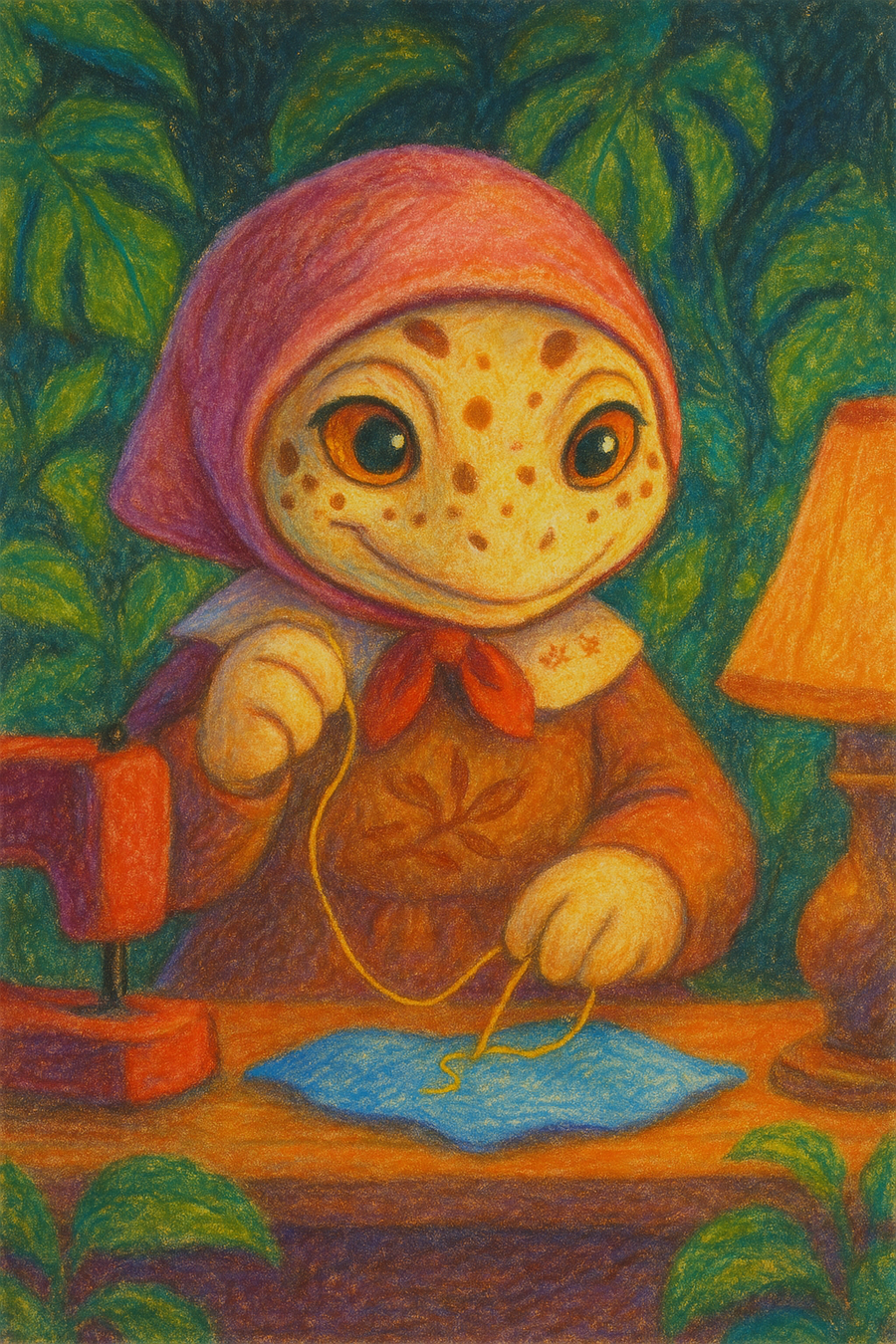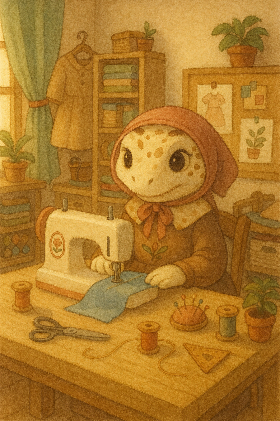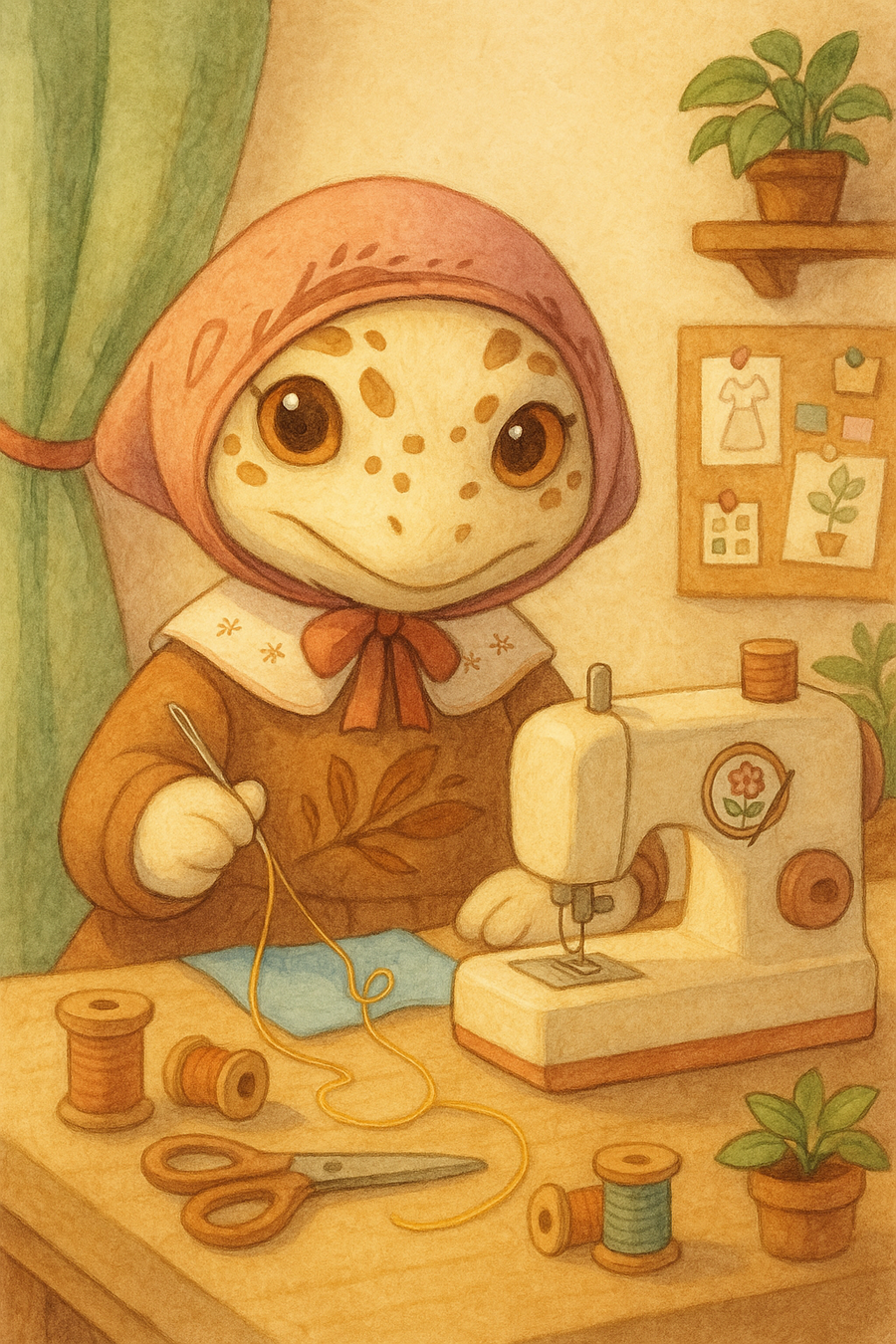 Chat GPT: Warm watercolor-style poster, 4:5. Anthropomorphic leopard gecko seamstress «Josephine» in a dusty-rose bonnet and warm-brown dress with leaf embroidery, seated at a compact cream sewing machine with terracotta accents. On the wooden table: blue fabric swatch under the presser foot, a few wooden spools, scissors, tiny potted plant. Background: sage curtain with thin red tie, cork board with soft, unreadable sketches. Golden cozy light, soft edges, paper texture, no text.