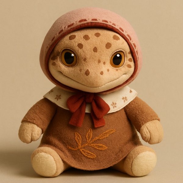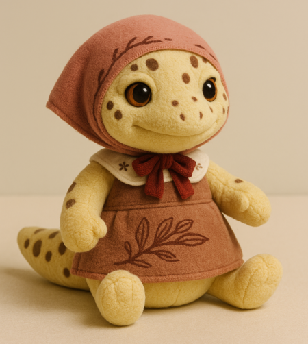 Chat GPT: Three-quarter (left) studio shot of the plush gecko Josephine. Soft minky pile visible on cheeks and tail; felt bonnet (dusty rose), embroidered leaf on brown dress, small bow under collar. Beige seamless sweep; softbox key at ~45°, mild rim to separate from background; clean contact shadow. Color palette warm/earthy; realistic fabric grain and stitching. No props, no text, no labels. Negative: over-saturation, motion blur, hard reflections, depth-of-field extremes.