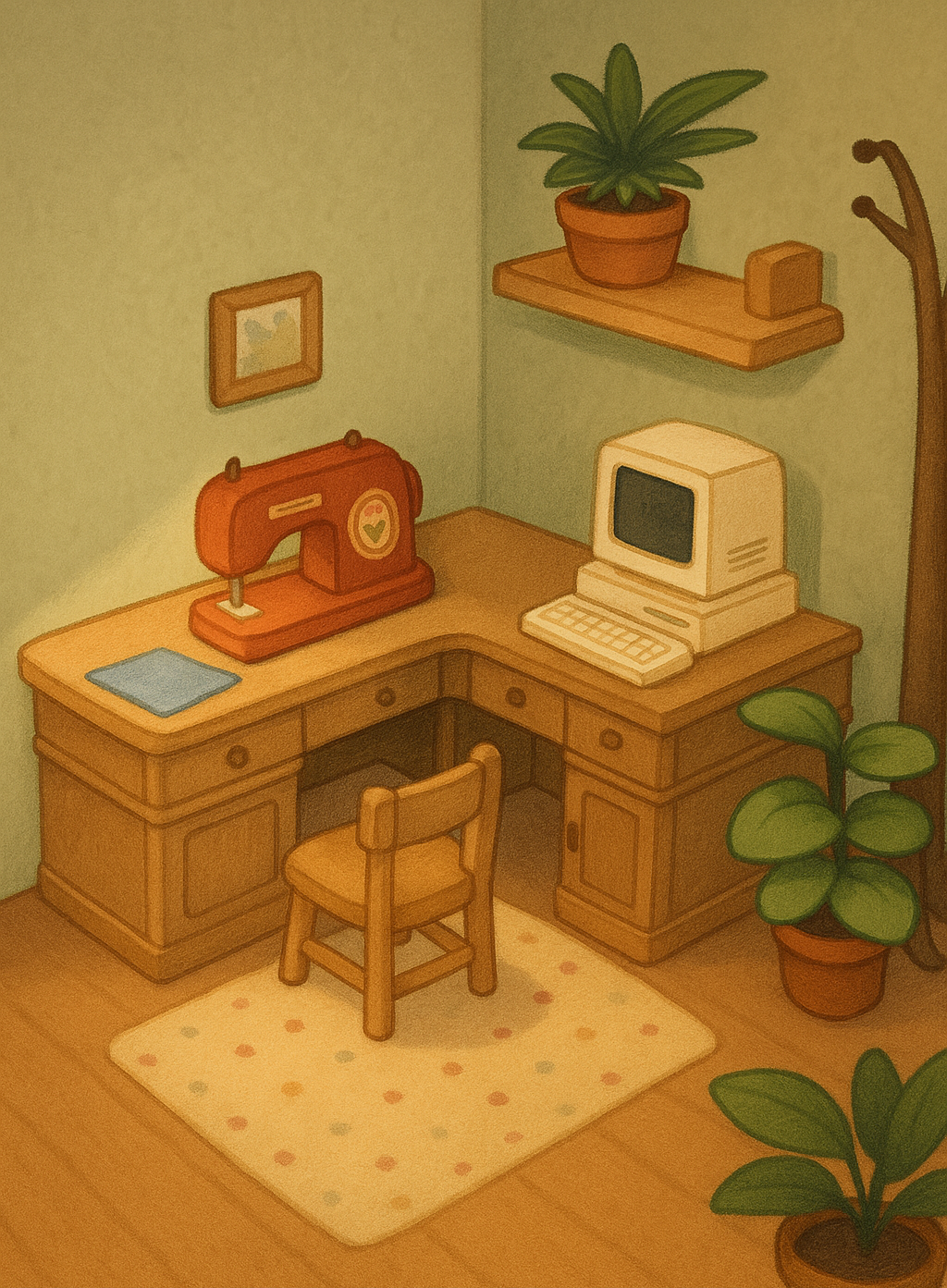 Chat GPT: Hand-drawn isometric cozy sewing corner, 4:5. L-shaped wooden desk, vintage red sewing machine, small beige CRT computer, wooden chair on a dotted cream rug, potted plants (pothos/peperomia), coat stand, small wall shelf. Calm sage walls with subtle mottling, warm ambient light, clean shapes, slightly soft edges, tactile paper feel. Minimal, text-free, production-ready composition.