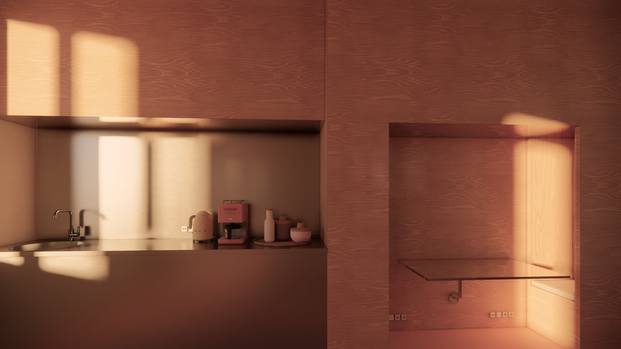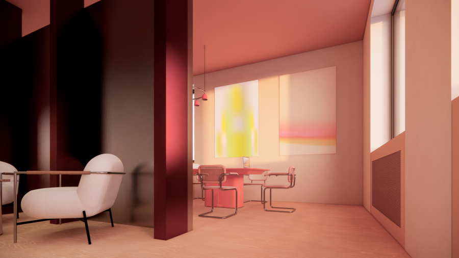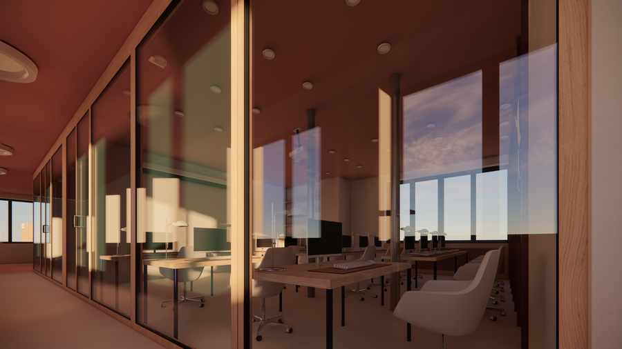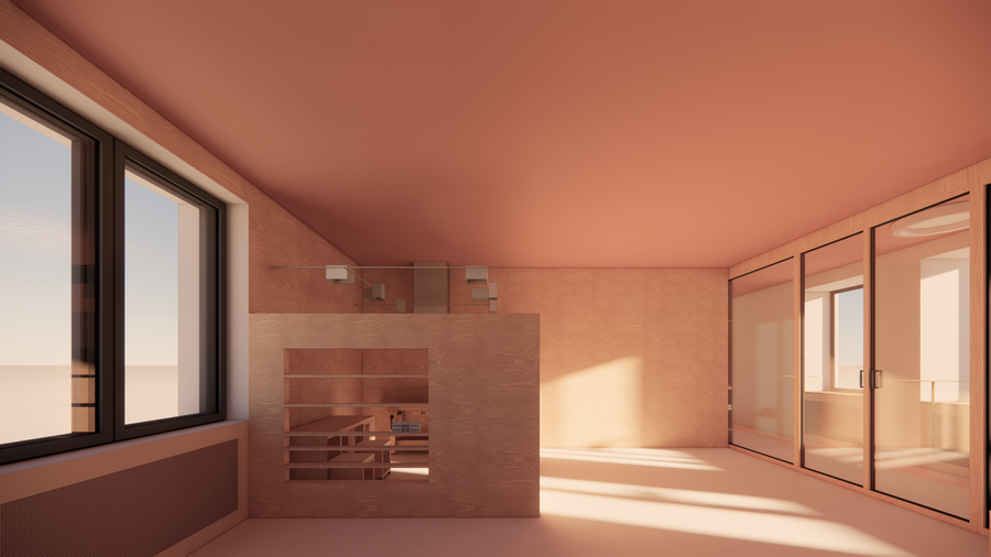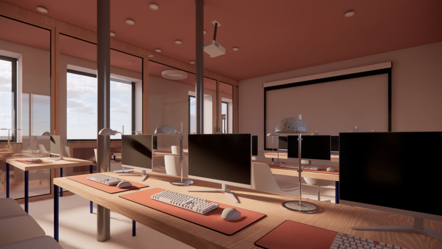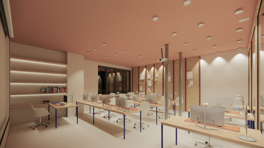 Мастерская решена как целостная монокомпозиция. Через стеклянные перегородки она воспринимается как единый деревянный блок с мебелью-трансформером. Главная задача — сохранить простор и многофункциональность, предоставив студентам свободу взаимодействия с пространством по их правилам.