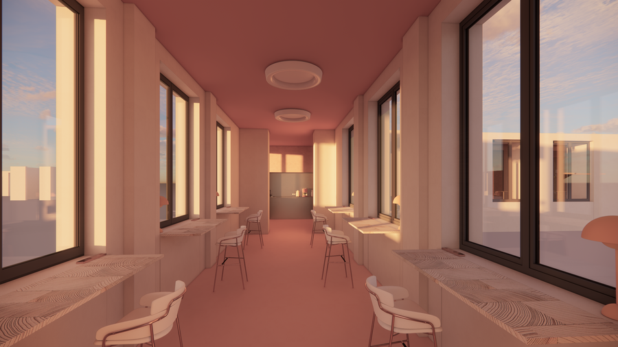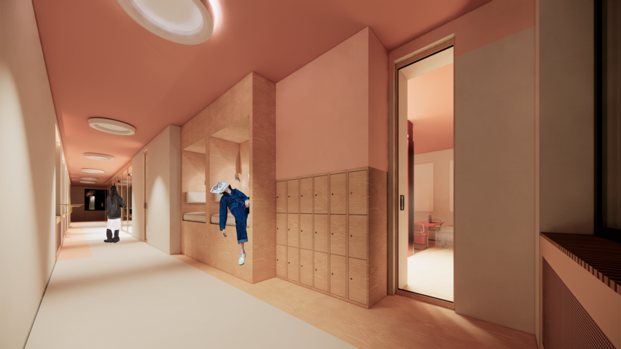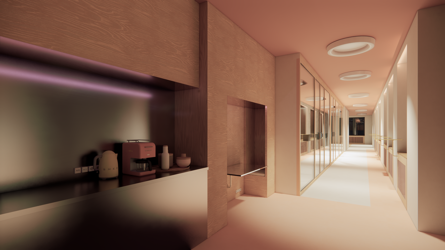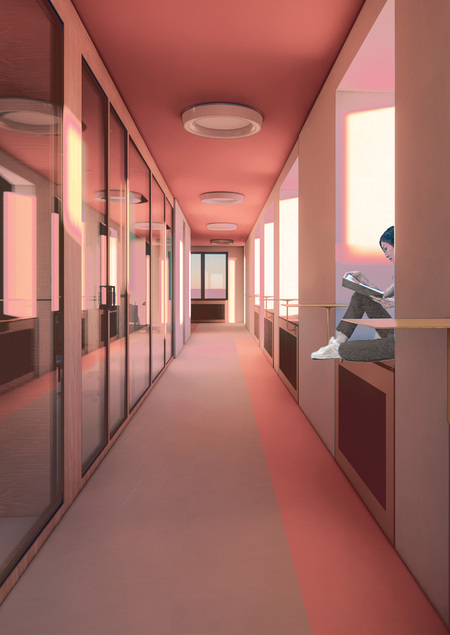 В проекте коридоры становятся многофункциональным пространством. Они служат не только для перемещения, но и для работы, отдыха и общения.