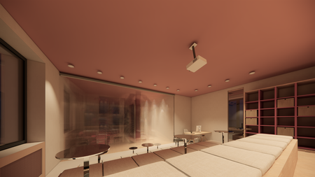 Во время лекций и просмотров раздвижной экран позволяет полностью затемнить лекционную зону для комфортного восприятия контента. В остальное время прозрачная поверхность равномерно освещает оба помещения, создавая ощущение единого светового пространства.