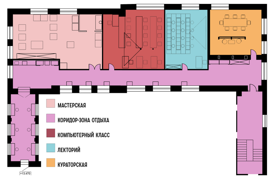 Широкие подоконники превращены в учебные и релакс-зоны. Такая организация позволяет эффективно использовать протяженное пространство коридора, создавая разнообразные сценарии для студентов.