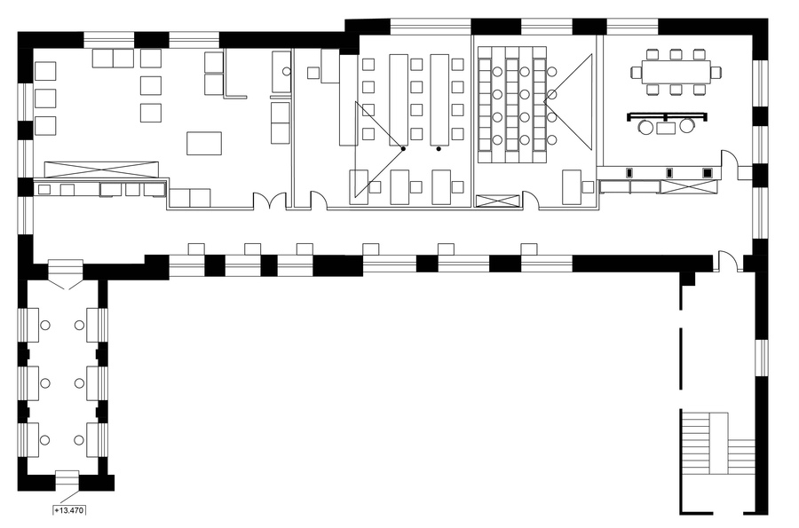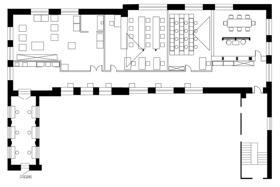 Стеклянная перегородка между лекторием и кураторской выполняет двойную функцию. В обычном режиме она обеспечивает визуальную связь между пространствами и максимальное проникновение естественного света.